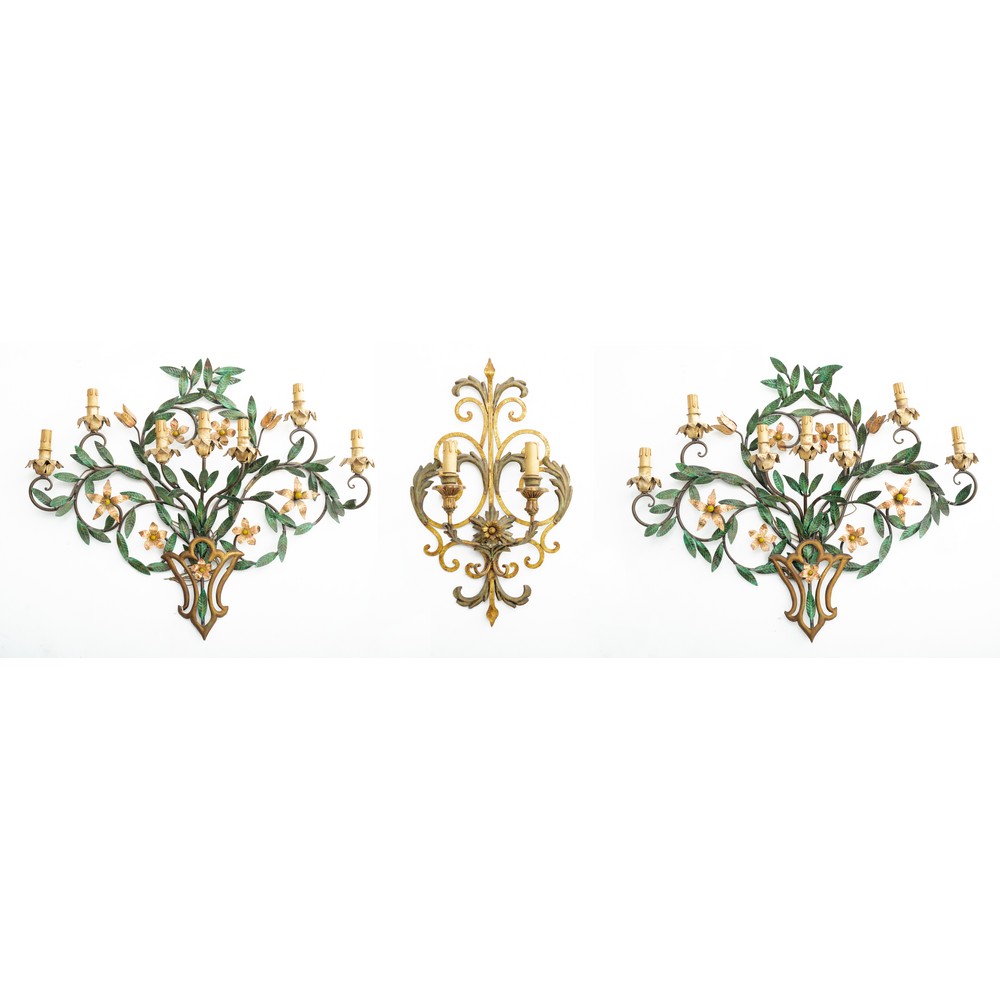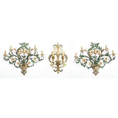 Coppia di applique in ferro dipinto a sette luci e applique in ferro a due luci.