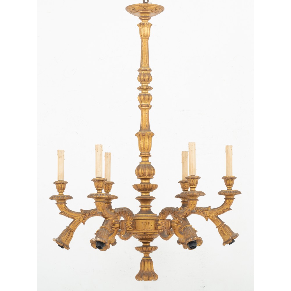 Lampadario di gusto Barocco a tredici luci in legno dorato.