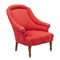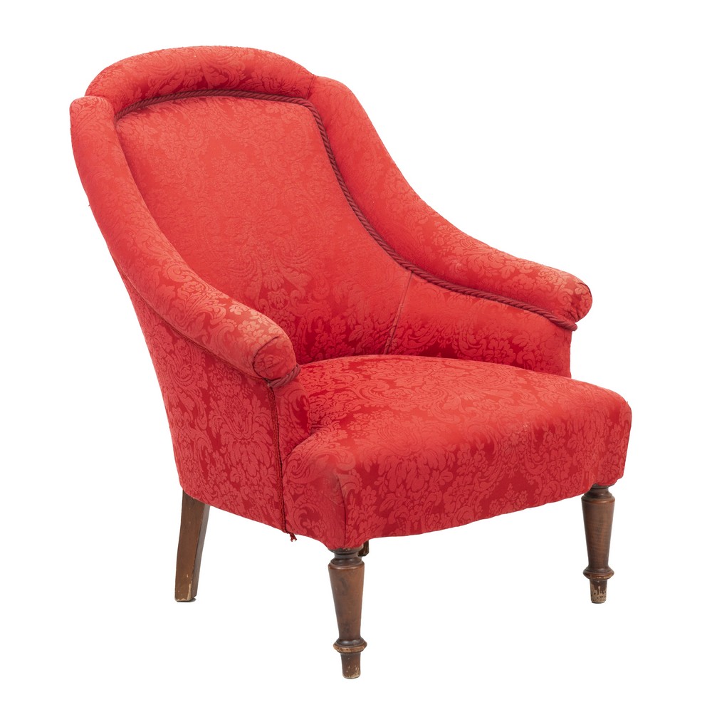 Poltrona da salotto con struttura in legno e tessuto in rosso damascato.