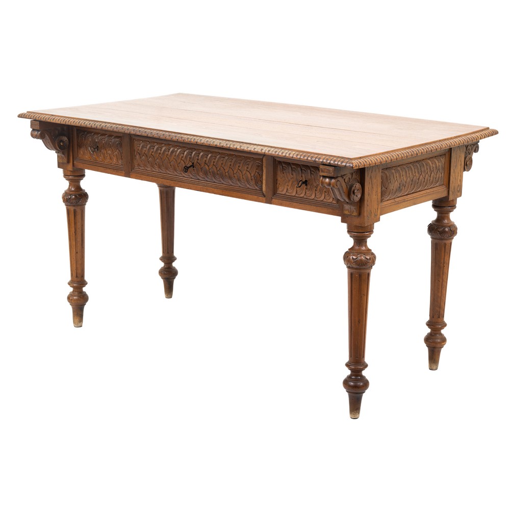 Scrittoio da centro con tre cassetti in legno di noce, bordure e decori riccamente intagliati.