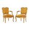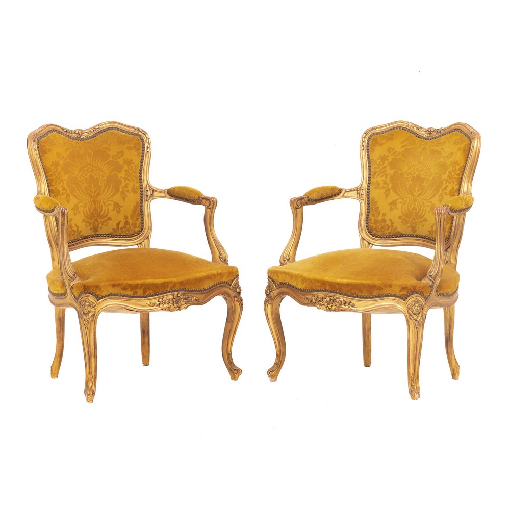 Coppia di poltrone stile Luigi XVI in legno dorato con seduta e spalliera imbottita in velluto nei toni del giallo.