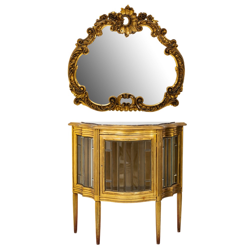 PICCOLA VETRINA ad un'anta di forma sagomata in legno dorato e piano incassato in marmo nero con specchiera in legno dorato e intagliato (usure).