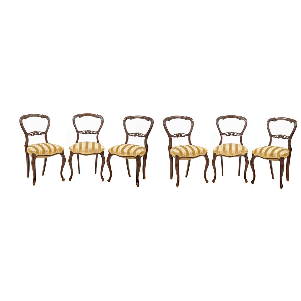 SEI SEDIE in legno di noce con seduta in tessuto.