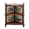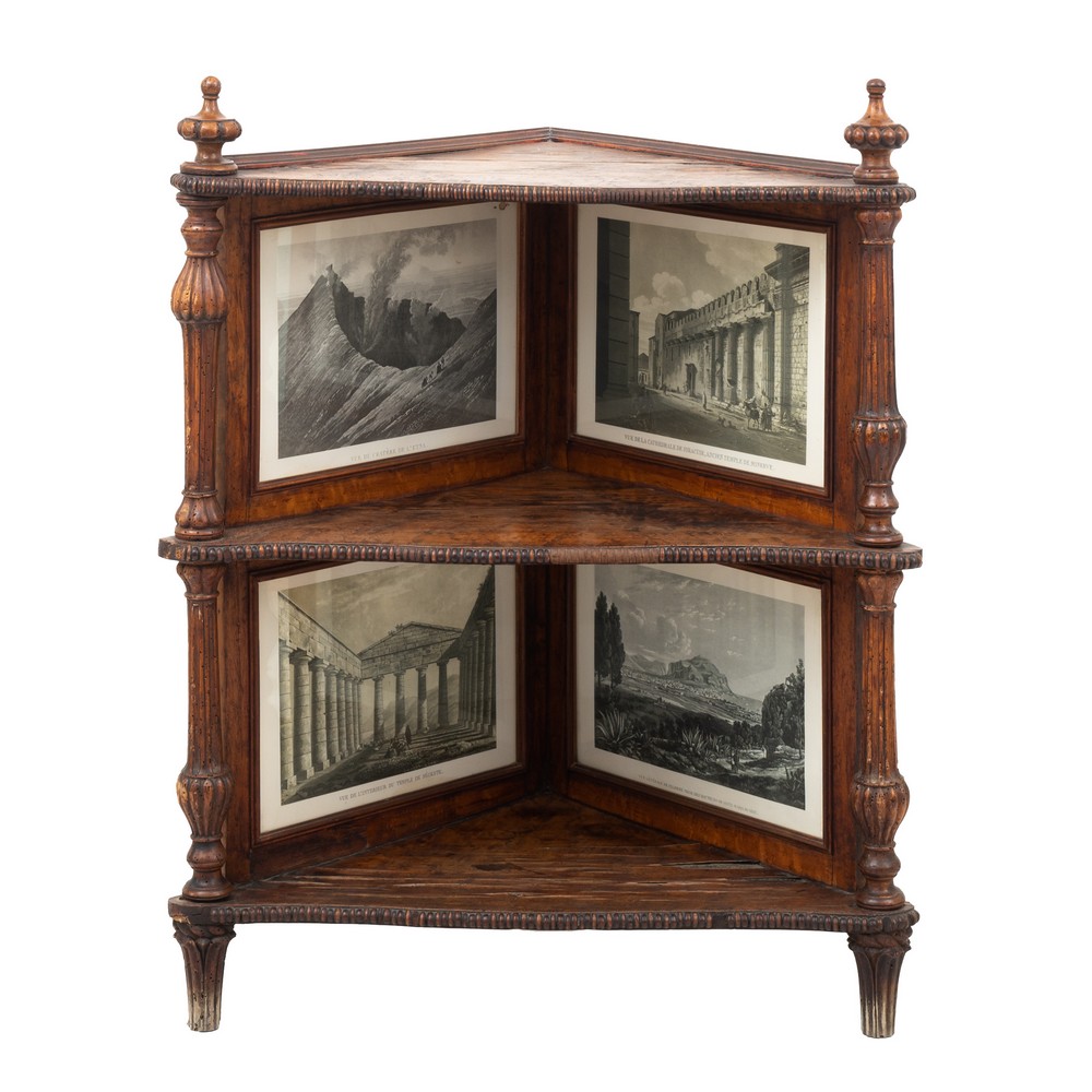 Angoliera in legno di noce a tre ripiani con stampe raffiguranti "Paesaggi e monumenti siciliani".