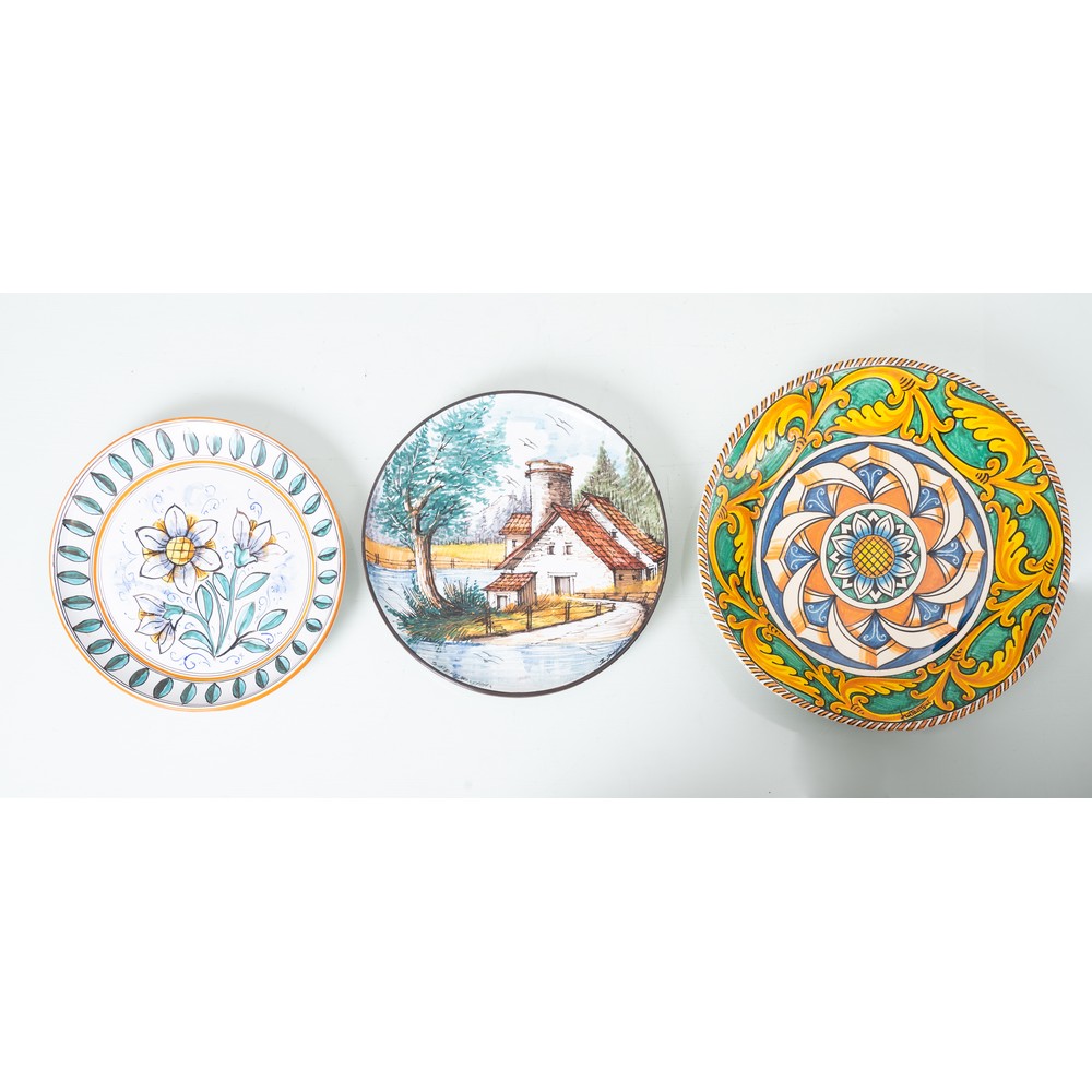 Due piatti, fangotto, tegola, quattro mattonelle, orologio, fioriera e centrotavola in ceramica smaltata e decorata raffiguranti "Soggetti vari".