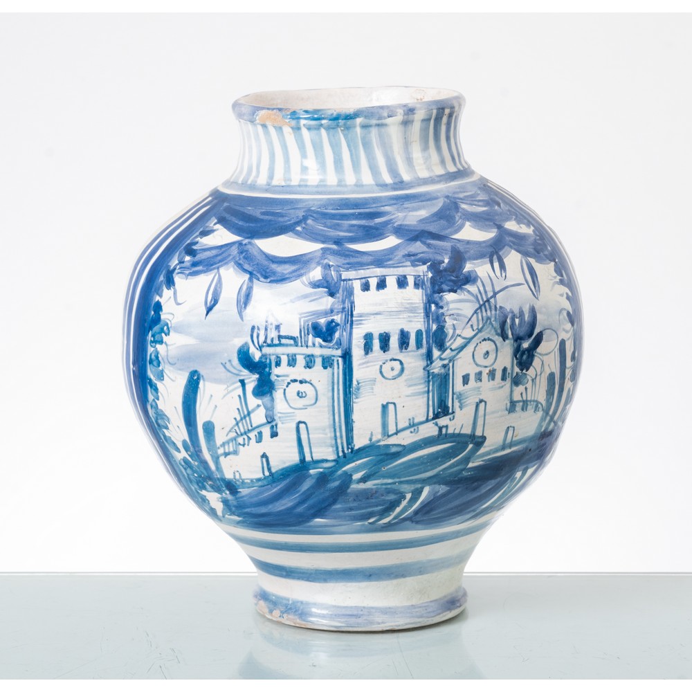 Boccia in ceramica decorata e smaltata nei toni del blu raffigurante "Paesaggio" (restauro e usure).