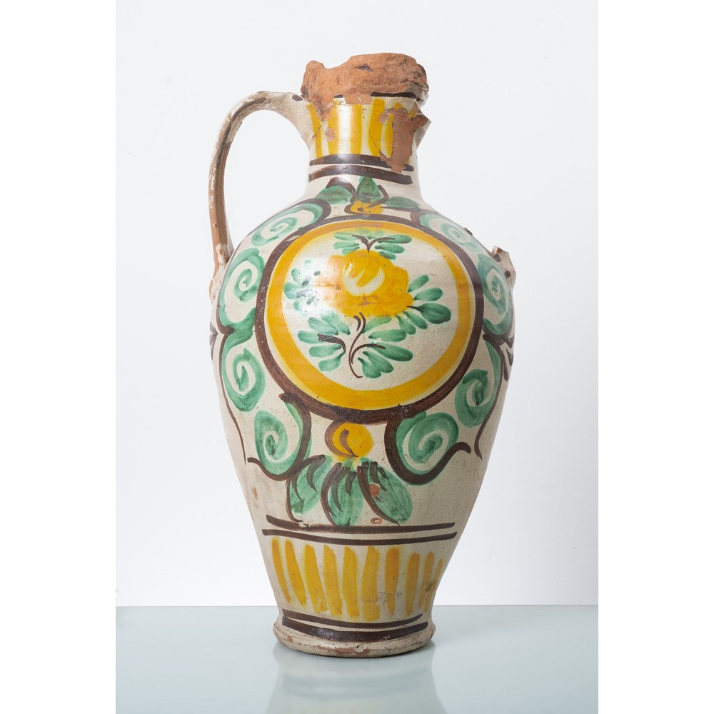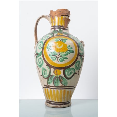 Quartara in ceramica decorata e dipinta a motivo floreale e fogliaceo datata 1892 (usure e mancanze).