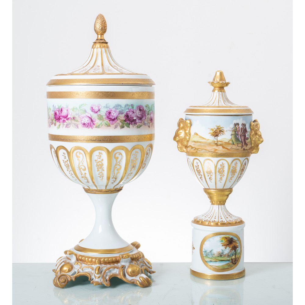 DUE POTICHE in porcellana Limoges bianca con decori in oro (usure).