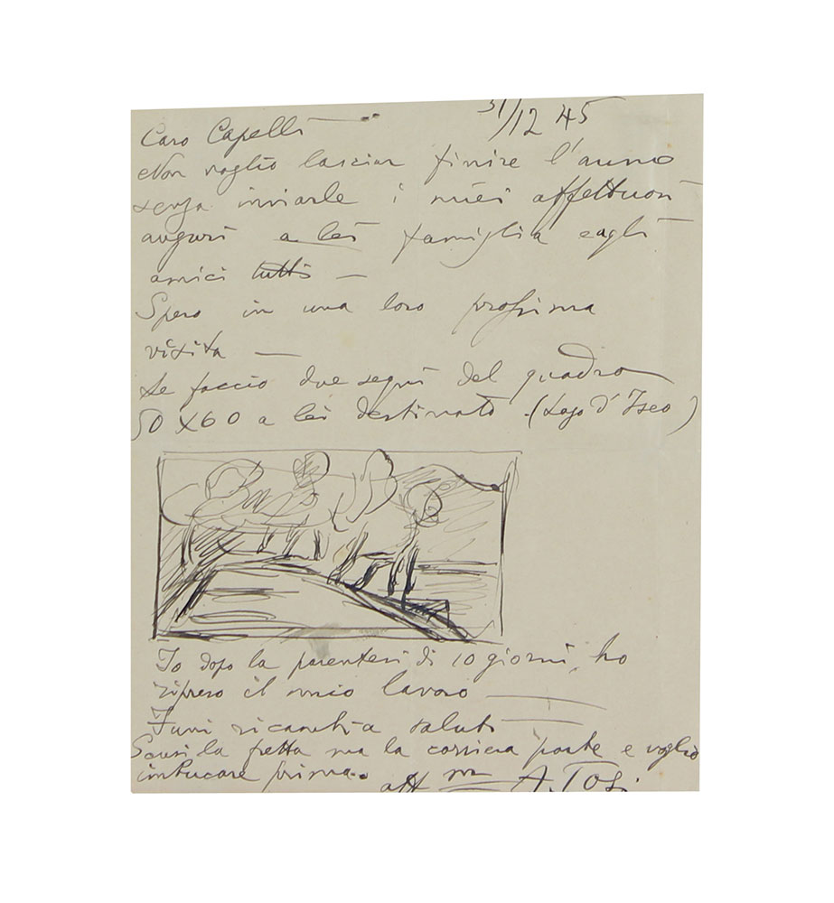Tosi Arturo Lettera con schizzo di paesaggio, 1945 inchiostro su carta, cm. 26,5x22 firmata in basso a destra e datata in alto senza cornice