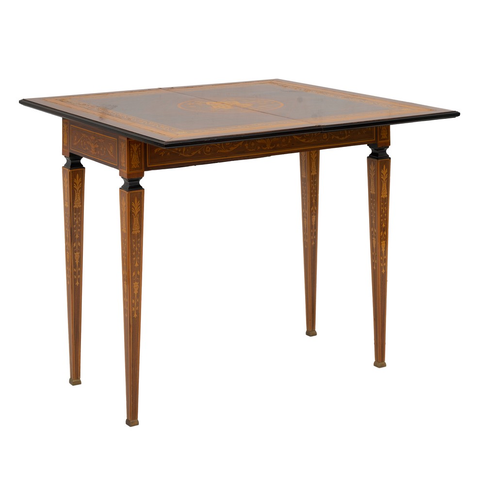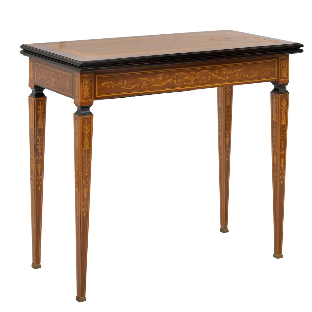 Tavolino da gioco stile Luigi XVI in legno di noce e mogano, con tarsie in bosso e varie essenze di legno, apertura a libro.