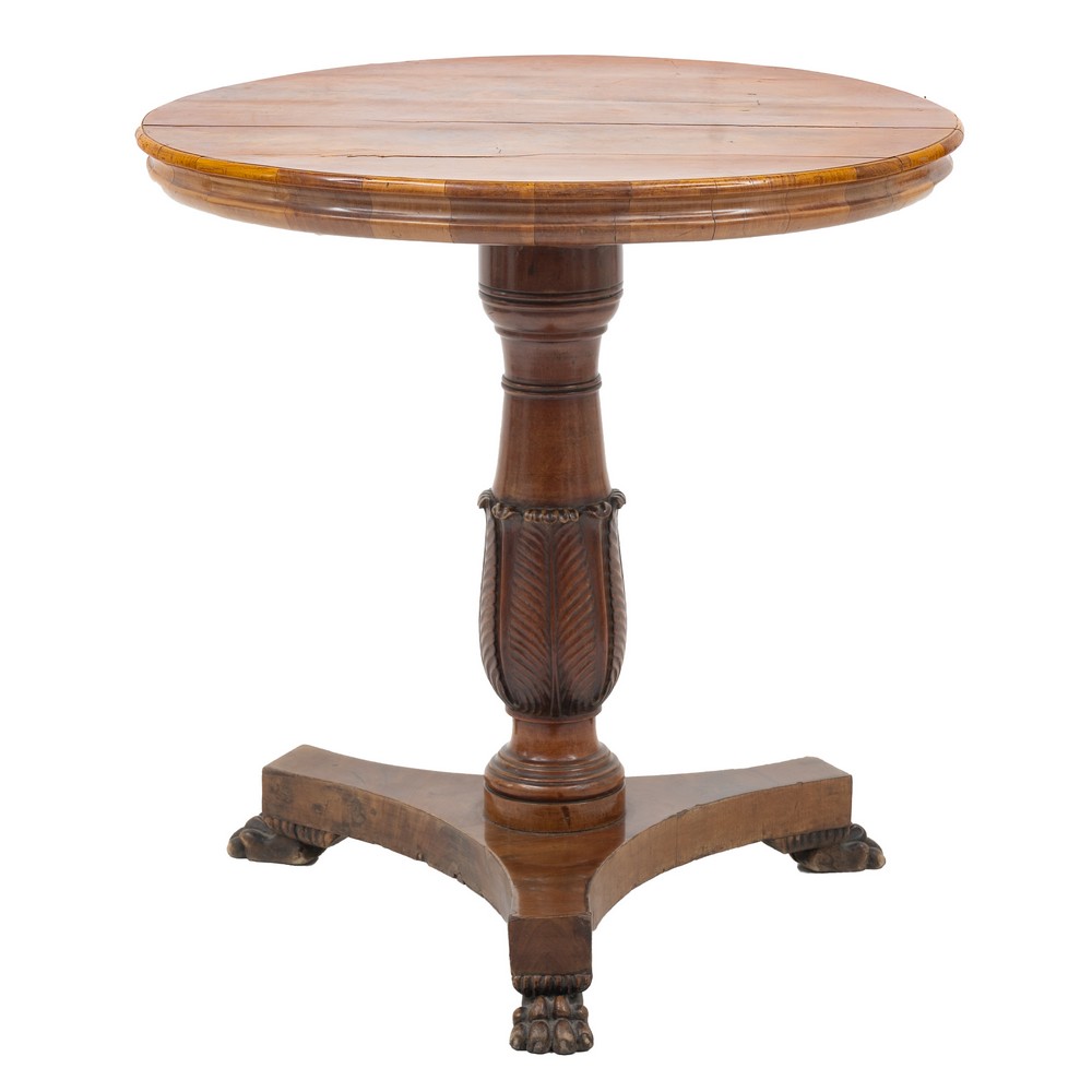 Tavolino Impero di forma circolare in legno di mogano e piuma di mogano.