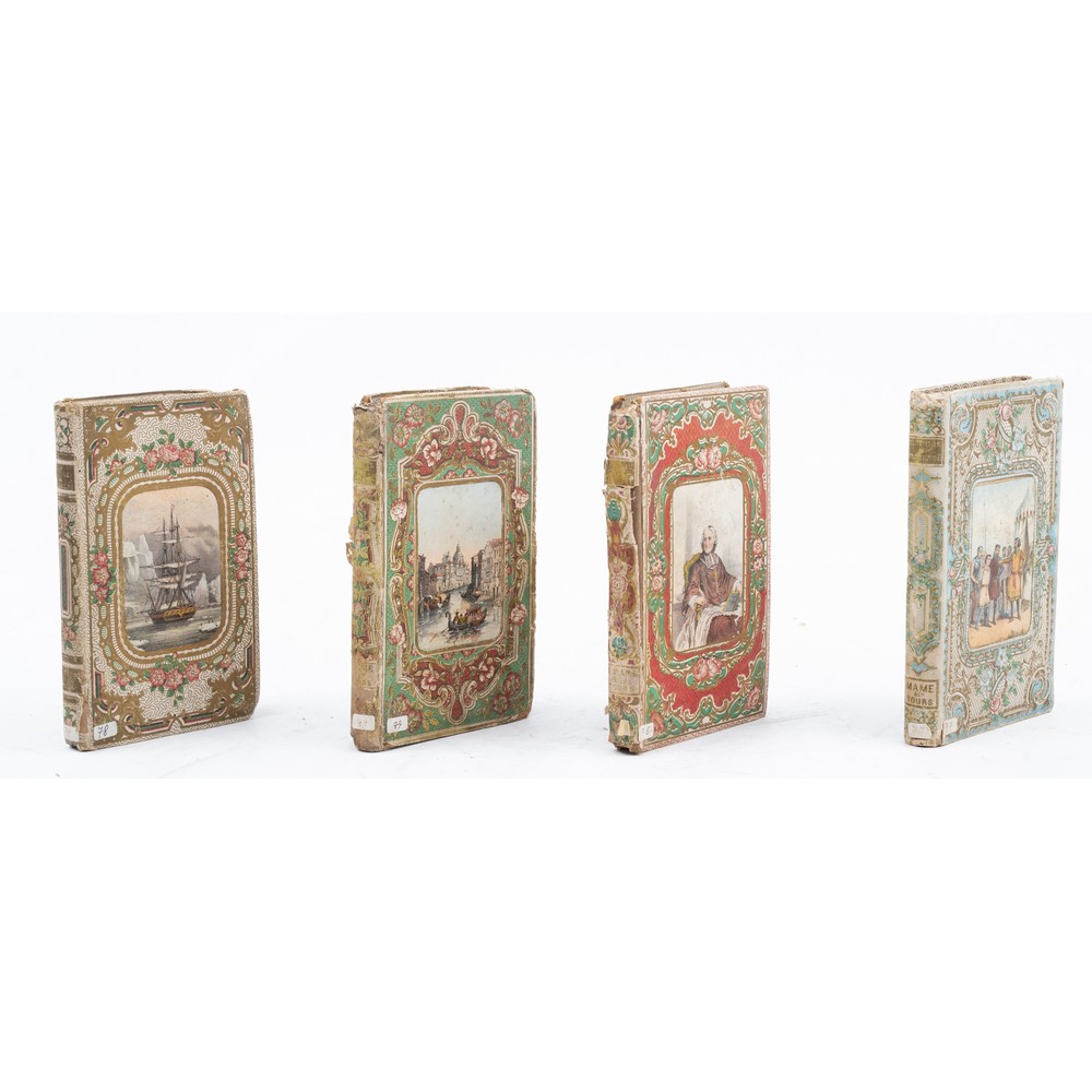QUATTRO VOLUMI IN 8° PICCOLO DELLA COLLANA BIBLIOTHEQUE DE LA JEUNESSE CHRETIENNE: 1) J. J. E. Roy HISTOIRE DE FLORENCE, ed. Tours, A. Mame 1855. Incisione all’antiporta della morte di Manfredi. Elaborata legatura artistica in cartonato decorato con illustrazione incorniciata entro il piatto anteriore. Particolare decoro floreale al piatto posteriore. Il volume presenta 5 xilografie f. t.. in ottime condizioni. Pp. (4), 284.2) LES MAUFRAGES AU SPITZBERG, ed. Tours, A. Mame 1858. Incisione all’antiporta con scena del naufragio. Elaborata legatura artistica in cartonato decorato con illustrazione incorniciata entro il piatto anteriore. Particolare decoro floreale al piatto posteriore. Tagli dorati. Il volume presenta altre tre xilografie f. t. Tagli dorati. In ottime condizioni. Pp. 284.3) J. J. E. Roy HISTOIRE DE BOSSUET EVEQUE DE MEAUX, ed. Tours, Alfred Mame et Fils 1866. Incisione xilografica all’antiporta e al frontespizio del Bossuet. Il volume contiene altre due xilografie f. t. Elaborata legatura artistica in cartonato decorato con illustrazione incorniciata entro il piatto anteriore. Piatto posteriore parzialmente slegato. Particolare decoro floreale al piatto posteriore. In buone condizioni. Pp. 283 (1). 4) F. Valentin HISTOIRE DE VENICE, ed. Tours, A. Mame 1855. Incisione all’antiporta dell’entrata dei francesi a Venezia. All’antiporta xilografia del “fidanzamento” del Doge di Venezia col mare Adriatico. Il volume contiene altre due xilografie f. t. Elaborata legatura artistica in cartonato decorato con illustrazione incorniciata entro il piatto anteriore. Particolare decoro floreale al piatto posteriore. Il volume presenta complessivamente cinque xilografie f. t. In buone condizioni. Pp. 283.