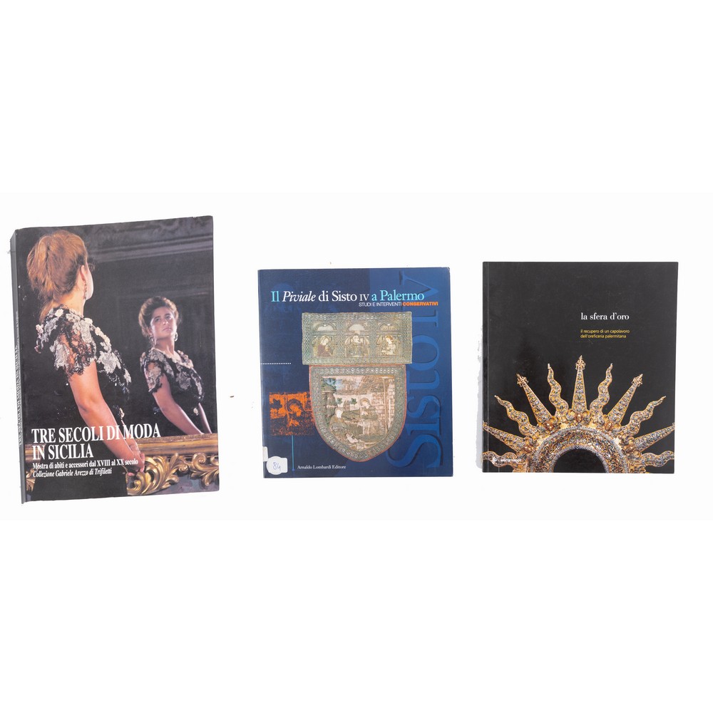 TRE VOLUMI D’ARTE: 1) AA. VV. IL PIVIALE DI SISTO IV A PALERMO. STUDI E INTERVENTI CONSERVATIVI, ed. Arnaldo Lombardi Editore, 1998. Edizione fuori commercio. Brossura editoriale illustrata. Cm 24 x 22. Pp. 150. 2) Vincenzo Abbate / Clarice Nicoletti LA SFERA D’ORO. IL RECUPERO DI UN CAPOLAVORO DELL’OREFICERIA SICILIANA, ed. Electa, Napoli 2003. Brossura editoriale illustrata. Cm 24 x 22. Pp. 165. 3) TRE SECOLI DI MODA IN SICILIA. MOSTRA DI ABITI E ACCESSORI DAL XVIII AL XX SECOLO COLLEZIONE GABRIELE AREZZO DI TRIFILETTI, ed. Provincia Regionale di Palermo. Mostra tenutasi a Palazzo Asmundo dal 27 Maggio al 6 Giugno 1991. Introduzione di Antonino Buttitta. Brossura editoriale illustrata con mezze ali. Cm 29,5 x 21,5. Pp. XXIII, 279.
