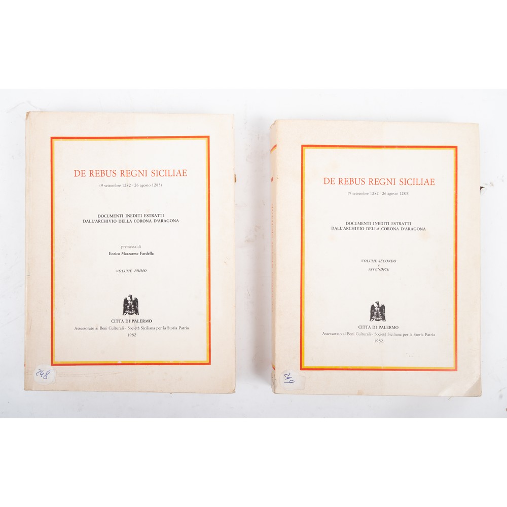 DUE VOLUMI a cura di Enrico Mazzarese Fardella DE REBUS REGNI SICILIAE (9 SETTEMBRE 1282 – 26 AGOSTO 1283). DOCUMENTI INEDITI ESTRATTI DALL’ARCHIVIO DELLA CORONA D’ARAGONA, ed. Città di Palermo 1982. In 2 volumi. Brossure editoriali con titoli in bicromia entro cornice colorata. Edito per il VII centenario del Vespro Siciliano 1282 - 1982. Cm 28 x 21. Pp. XVI, 796 continuative, XXVIII, 166. Raro.