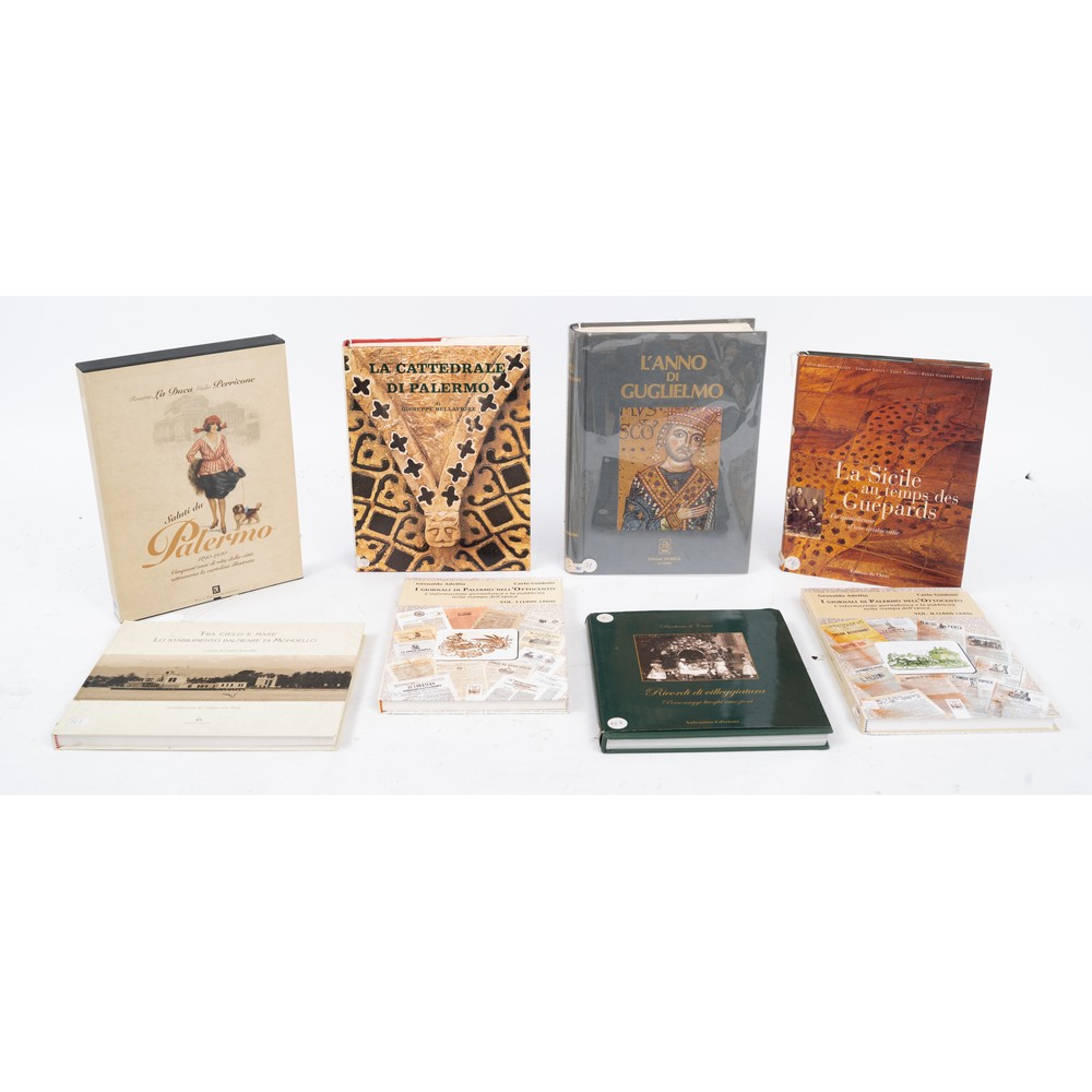 OTTO VOLUMI D’ARTE SULLA SICILIA: 1) Giuseppe Bellafiore LA CATTEDRALE DI PALERMO, ed. S. F. Flaccovio 1976. 1^ edizione. Cm 33 x 25. Bella legatura editoriale con titolo e stemma della Cattedrale impressi in oro al piatto e titoli in oro al dorso. Sopraccoperta editoriale illustrata. Contropiatti e guardie illustrate da una stampa d’epoca della città di Palermo. Pp. 418. 2) Laura Inzerillo – a cura di – TRA CIELO E MARE. LO STABILIMENTO BALNEARE DI MONDELLO, ed. Caracol, Palermo 2009. In formato orizzontale cm 25 x 31. Legatura editoriale rigida plastificata illustrata. Pp. 222. 3) Rosario La Duca / Giulio Perricone SALUTI DA PALERMO 1890 – 1940. CINQUANT’ANNI DI VITA DELLA CITTA’ ATTRAVERSO LA CARTOLINA ILLUSTRATA, ed. Dario Flaccovio 2007. All’antiporta dedica autografa degli autori a Gabriele Arezzo di Trifiletti. Legatura editoriale rigida con sopraccoperta editoriale illustrata. Volume contenuto in cofanetto editoriale rigido illustrato a specchio. Cm 34 x 25. Pp. 462. 4) Barbara di Castri RICORDI DI VILLEGGIATURA. PERSONAGGI LUOGHI EMOZIONI, ed. Valentina, Milano 2007. Prefazione di Gaetano Barbiano di Belgiojoso. Cm 27 x 25. Legatura editoriale rigida con sopraccoperta editoriale illustrata. Pp. 207. 5) AA. VV. LA SICILE AU TEMPS DES GUEPARDS. VIE QUOTIDIENNE D’UNE ARISTOCRATIE, ed. Editions du Chene, 2000. Legatura editoriale rigida con sopraccoperta editoriale illustrata. Cm 32 x 24. Pp. 184. 6) Gesualdo Adelfio / Carlo Guidotti I GIORNALI DI PALERMO NELL’OTTOCENTO, Edizioni Ex Libris, Palermo 2018. Collana “Il Mosaico”. Vol. 1 e 2. Dedica dell’autore Adelfio all’antiporta. Legatura editoriale rigida plastificata illustrata. Cm 30,5 x 22. Pp. 199 (vol. 1); 243 (vol.2). 7) AA. VV. L’ANNO DI GUGLIELMO 1189 – 1989. MONREALE PERCORSI TRA ARTE E CULTURA, ed. Dorica, Palermo 1989. Cm 35 x 26. Legatura editoriale in seta grigia con fotoapplicazione al piatto e acetato protettivo editoriale trasparente. Titoli in oro al piatto e al dorso. Contropiatti e guardie figurate con gli stemmi della dinastia normanna. Pp. 405.