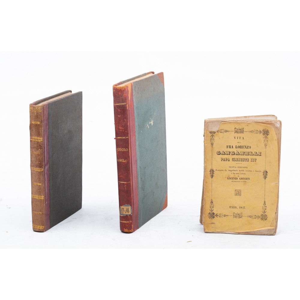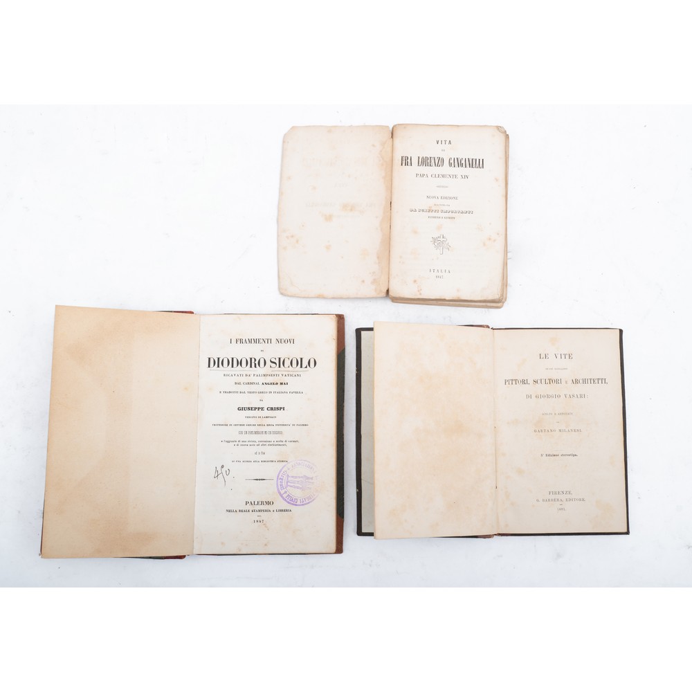 TRE VOLUMI DI VARIA DEL XIX SECOLO: 1) Giorgio vasari LE VITE DE’ PIU’ ECCELLENTI PITTORI, SCULTORI E ARCHITETTI, ed. Firenze, G. Barbera 1881. In 8° piccolo. Rilegatura successiva in mezza pelle con piatti in percallina rigida. Pagine leggermente brunite dal tempo. Pp. VII, 265, (1). 2) Giuseppe Crispi I FRAMMENTI NUOVI DI DIODORO SICOLO RICAVATI DA PALIMPSESTI VATICANI DAL CARDINAL ANGELO MAI, ed. Palermo, Nella Reale Stamperia 1847. In 8°. Rilegatura successiva in mezza pelle con piatti in tela rigida con angoli. Leggere usure d’uso alla coperta ma pagine pulite e ben tenute. Timbro di appartenenza. Pp. 214, (2). 3) VITA DI FRA LORENZO GANGANELLI PAPA CLEMENTE XIV, ed. Italia 1847. Con una lettera di Vincenzo Gioberti all’editore romano. In 16°. Brossura editoriale. Dorso usurato. Pp. 294.