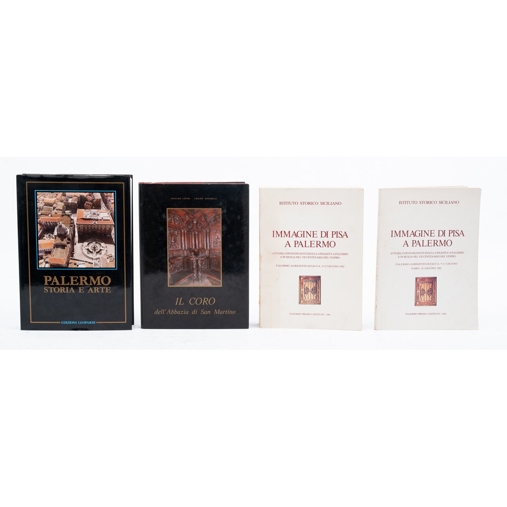 QUATTRO VOLUMI D’ARTE SU PALERMO: 1) Istituto Storico Siciliano IMMAGINE DI PISA A PALERMO, Palermo 1983. 2 volumi in 4°. Brossura editoriale in cartonato flessibile illustrato. I 2 volumi raccolgono gli atti del famoso convegno di studi sulla pisanità a Palermo e in Sicilia tenutosi in occasione del VII centenario del Vespro a Palermo, Agrigento e Sciacca dal 9 al 12 Giugno 1982 ed a Naro il 16 Giugno 1982. Con un ricco apparato fotografico ed iconografico. Pp. XII, 633, 2; 56. 2) Anselmo Lipari / Ubaldo Mirabelli IL CORO DELL'ABBAZIA DI SAN MARTINO , ed. Abbazia di San Martino 1985. Legatura editoriale in piena tela rigida e sopraccoperta editoriale illustrata. Contropiatti e guardie illustrate. Cm 31 x 22. Pp. 174. 3) AA. VV. PALERMO STORIA E ARTE, ed. Leopardi, 1991. Fotografie di Ettore Magno. Cm 32 x 23. Pp. 469. Legatura editoriale rigida. Sopracoperta editoriale illustrata. Guerdie figurate con stemma della città di Palermo.