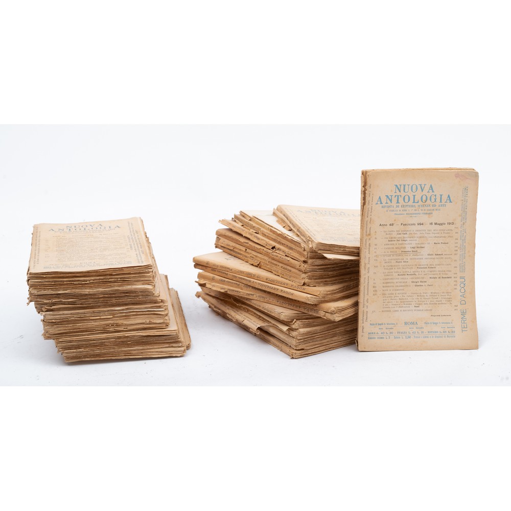 TRENTATRE NUMERI DELLA NUOVA ANTOLOGIA. RIVISTA DI LETTERE, SCIENZE ED ARTI, ed. Roma 1910 – 1913. In 8°. Tutti i numeri in brossura editoriale ed in buone condizioni. Nuova Antologia è un periodico trimestrale di lettere, scienze e arti fondato nel gennaio 1866 a Firenze, come ideale continuazione dell'«Antologia» del Vieusseux, ed è tra le più longeve e prestigiose riviste italiane in attività. Pp. circa 170 a numero.