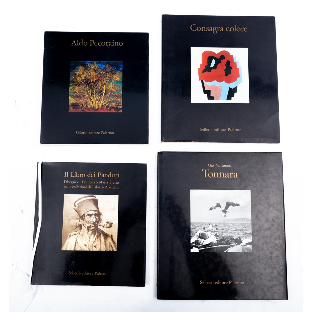 QUATTRO VOLUMI D’ARTE EDITI DA SELLERIO: 1) ALDO PECORAINO, Palermo 1989. Catalogo pubblicato in occasione della mostra tenutasi dal 4 al 26 Novembre 1989 alla Civica Galleria d’Arte Moderna Empedocle Restivo. Dedica autografa dell’autore al frontespizio. In formato carrè cm 24 x 22. Brossura editoriale in cartonato flessibile illustrato. Con le fotoriproduzioni delle opere esposte. Pp. 266. 2) CONSAGRA COLORE a cura di Eva di Stefano, Palermo 1991. Catalogo pubblicato per la mostra tenutasi allo Steri di Palermo dal 27 Aprile al 27 Maggio 1991. Cm 28 x 25. Brossura editoriale in cartonato flessibile illustrato. Con le fotoriproduzioni delle opere esposte ed un excursus sulla sua attività. Pp. 109. 3) IL LIBRO DEI PANDURI, DISEGNI DI DOMENICO MARIA FRATTA NELLE COLLEZIONI DI PALAZZO ABATELLIS, catalogo della mostra tenutasi a Palazzo Abatellis dal 10 Novembre 1994 al 5 Febbraio 1995. A cura di Vincenzo Abbate ed Angelo Mazza. In formato carrè cm 24 x 22. Brossura editoriale in cartonato flessibile illustrato. Pp. 207. 4) Giò Martorana TONNARA, Palermo 1995. Cm 29 x 25,5. Saggi di Jean-Louis Durand, Rosario Lentini con 104 fotografie in bianco e nero f. t. Cm 24,5x28. Legatura editoriale in tela nera con impressioni in oro e fotoapplicazione a specchio al piatto anteriore. Sopraccoperta editoriale illustrata. Le straordinarie fotografie di Giò Martorana su una delle pesche più antiche e misteriose del Mediterraneo. Pp. 138.