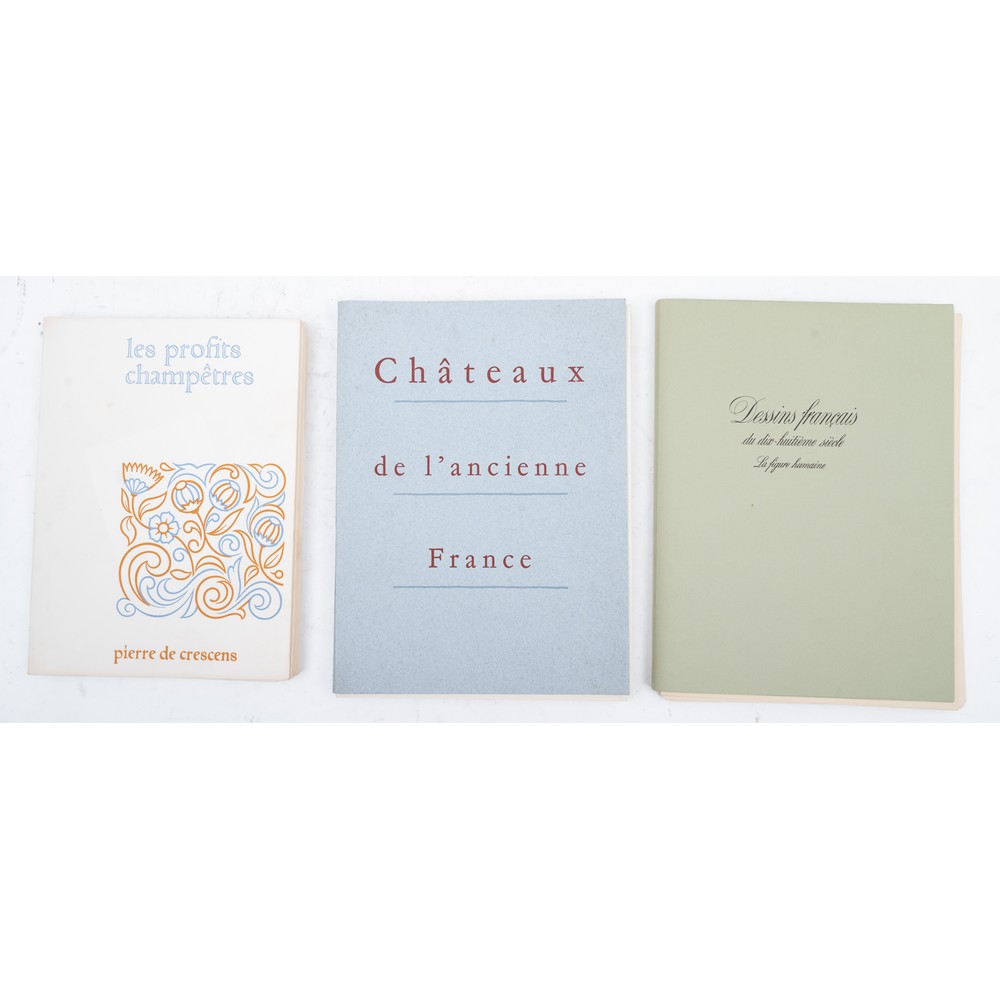TRE PUBBLICAZIONI IN LINGUA FRANCESE: 1) CHATEAUX DE L’ANCIENNE FRANCE, ed. Credit Lyonnais 1957. Prefazione di André Maurois In 4° . Scatola editoriale contenente 80 tavole sciolte non numerate; alcune applicate su cartoncino. 2) DESSIN FRANCAIS DU DIX-HUITIEME SIECLE, ed. Credit Lyonnais 1959. Testi di Gerard Bauer. In 4°. Scatola editoriale contenente VIII pagine a foglio e 32 tavole sciolte non numerate.3) Pierre de Crescens LES PROFITS CHAMPETRES, ed. Credit Lyonnais 1965. In-4°. 84 pagine di testo, in brossura editoriale con sovraccoperta a risvolti con illustrazione floreale stilizzata bicroma. 12 tavole a colori f.t. su 'velin héliomat' delle Papeteries Arjomari riproducenti miniature medievali e protette da veline parlanti. Eccellente esemplare a fogli sciolti, entro custodia editoriale in piena tela rossa cangiante con titolo in oro. Prima edizione in francese moderno del più importante trattato agronomico del Medioevo. Riservata agli amici del Crédit Lyonnais.