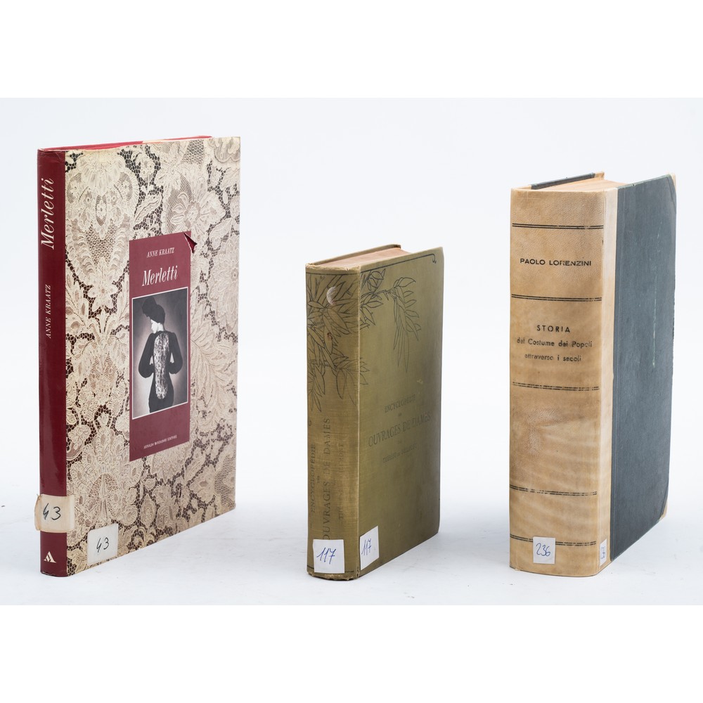 TRE VOLUMI SU COSTUME, MODA E TESSUTI: 1) Paolo Lorenzini STORIA DEL COSTUME DEI POPOLI ATTRAVERSO I SECOLI, ed. Nerbini, Firenze 1934 – XII. Con i quadri a colori di Tancredi Scarpelli. Stampato su due colonne. Legatura novecentesca in mezza pergamena con angoli e piatti cartonati rigidi. Volume in buone condizioni con qualche menda e riparazione. Tavole a colori a piena pagina. Con le famose tavole 10 e 11 che fecero scandalo essendo considerate troppo osè per i tempi. Pp. 847.2) Therese de Dillmont ENCYCLOPEDIE DES OUVRAGES DE DAMES, ed. Mulhouse, Th. de Dillmont, senza data ( ma fine ‘800 inizio 900). In 8vo grande. Legatura editoriale in percallina verde con titolo e fregi in nero. Pp. (10), 746 + 54 pagine non numerate di avvisi editoriali ed indice. Con XVII tavole a colori e più di 1000 figure. 3) Anne Kraatz MERLETTI, ed. Arnoldo Mondadori 1988. Formato cm 32 x 24. Legatura editoriale rigida in piena tela rossa. Titoli in oro al dorso. Sovracoperta editoriale illustrata. Titolo originale dell'opera: Dentelles. Traduzione di Lidia Zazo. All'interno presenti numerose tavole illustrate in b/n e a colori. Pp. 191.
