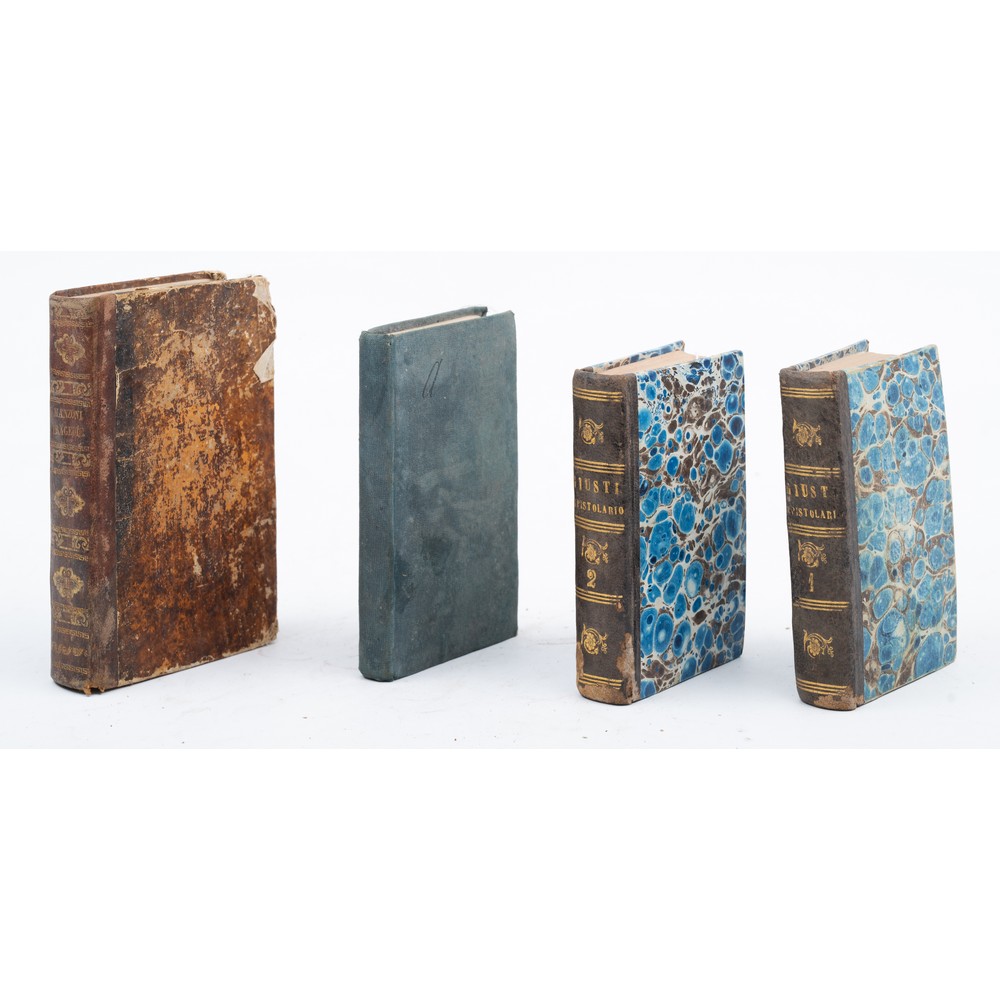 QUATTRO VOLUMI DEL XIX SECOLO DI LETTERATURA: 1) Giuseppe Parini POESIE, ed. Milano, Società Tipografica de’ Classici Italiani, 1841. In 24°. Le poesie comprendono: il Mattino, il Mezzogiorno, il Vespro, la Notte. Odi. Sonetti. Frammenti. Piccola mancanza al frontespizio. Precede la Vita di Parini scritta da Francesco Reina. Graziosa edizione con legatura coeva in piena tela rigida muta. 2) Alessandro Manzoni TRAGEDIE DI ALESSANDRO MANZONI MILANESE. IL CONTE DI CARMAGNOLA E L’ADELCHI, ed. Pisa, Niccolò Capurro 1826. In 16°. Legatura coeva in mezza pelle e piatti marmorizzati. Titoli, fregi e decori in oro al dorso. Usure d’uso alla coperta. Alcune sporadiche gore ma carte in ottime condizioni. pp. 487. 3) Giuseppe Giusti EPISTOLARIO, ed. Malta 1870. 2 volumi in 24°. Legature coeve in mezza pelle e piatti marmorizzati. Titoli, fregi e filetti in oro al dorso. Pp. 605; 603.