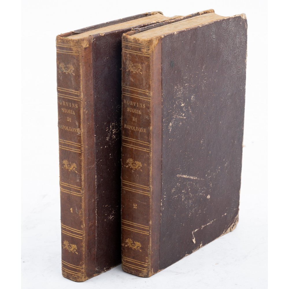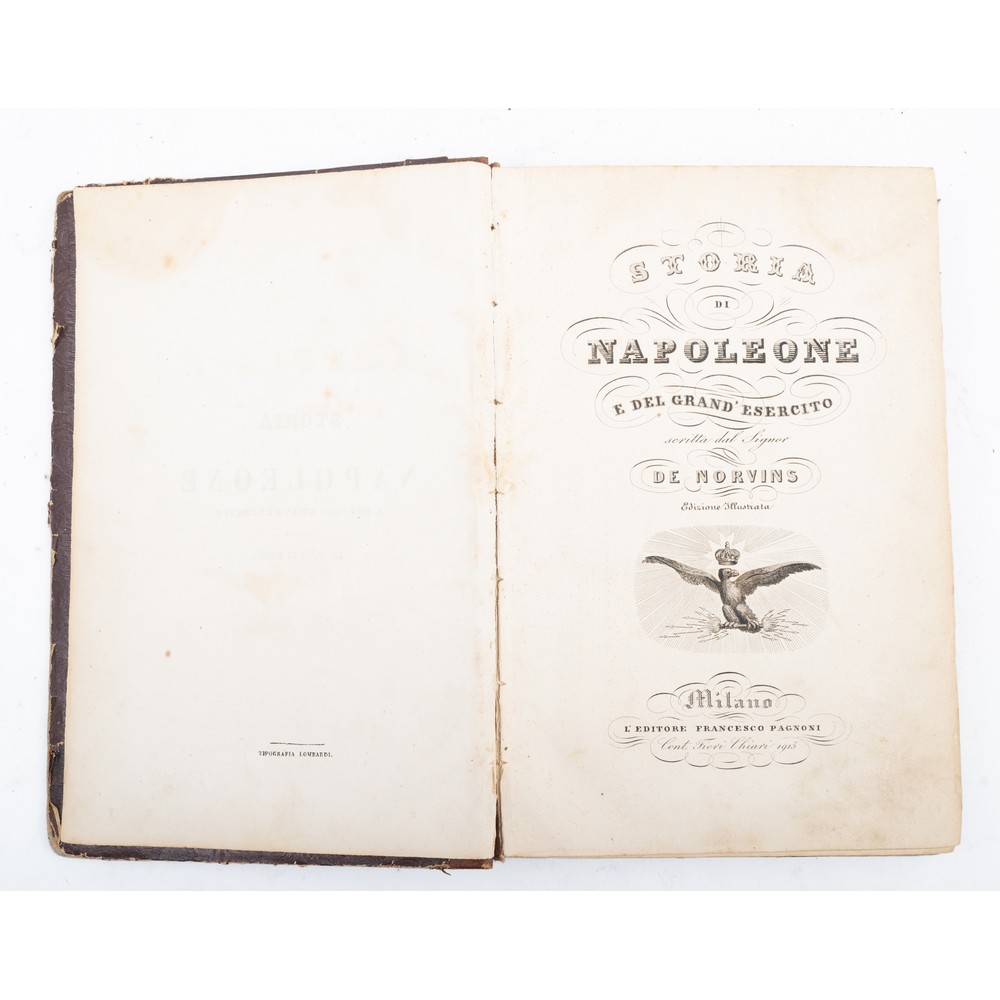 Jacques de Norvins STORIA DI NAPOLEONE DEL GRAND’ESERCITO. EDIZIONE ILLUSTRATA, Milano, Francesco Pagnoni s. d. ( ma 1850). In 2 volumi in 8°. Legature coeve in mezza pelle con titoli, fregi e filetti in oro ai dorsi. Segni d’uso alle coperte. Ritratti di Napoleone e Giuseppina alle antiporte. Pp . [4] 376, [4] 446 [3]. In ottimo stato con le tavole illustrative incise da Gandini, Santa Maria, Clerici, Stoppi, Bucinelli, Sivalli, Guzzi, Mantovani e altri. 4 tavole con facsimile delle lettere di Giuseppina e Napoleone e relative traduzioni.