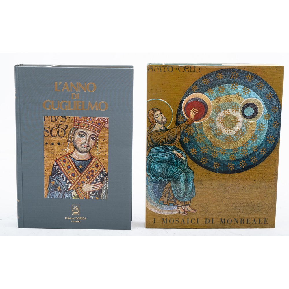 DUE VOLUMI D’ARTE: 1) Ernst Kitzinger I MOSAICI DI MONREALE ed. Flaccovio 1991. Riedizione del 1960. Cm 30,5 x 28,5. Legatura in tela verde editoriale con titolo in oro impresso al dorso e al piatto, sovraccoperta policroma, 132 pagine, 102 tavole a colori fuori testo, illustrazioni in nero e a colori nel testo, XV pagine con elenco delle tavole e note sui restauri e con l’indice dei principali cicli di Monreale. 5 cartine dei rilievi architettonici, di cui tre ripiegate. Riproduzione integrale della prima edizione pubblicata nel 1960. Traduzione di Fanny Bonajuto.2) AA. VV. L’ANNO DI GUGLIELMO, ed. Dorica, Palermo 1989. Cm 35 x 25. Legatura editoriale in piena tela con fotoapplicazione al piatto e titoli in oro al piatto e al dorso. Acetato trasparente protettivo editoriale. Volume in perfette condizioni. Volume pubblicato in occasione dell’8° centenario della morte del sovrano siciliano Guglielmo II d’Altavilla. Pp. XVI, 405.