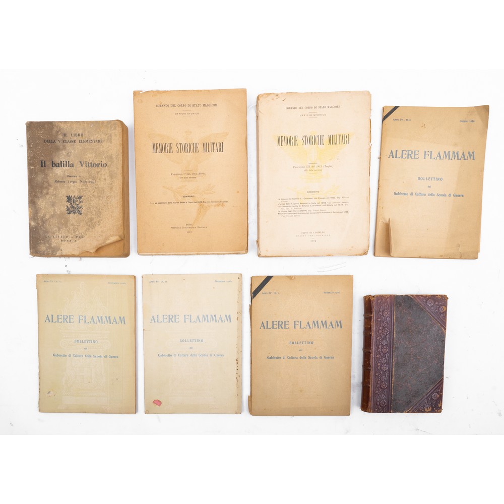 OTTO VOLUMI DI MILITARIA E VARIA: 1) MEMORIE STORICHE MILITARI, 2 volumi in 8° del 1912 (Fascicoli I e III) editi a Roma presso Officina Poligrafica Editrice e a Città di Castello presso Unione Arti Grafiche. In brossura editoriale. Volumi in buone condizioni. I Fascicoli sono ancora intonsi. Pp. 228; 703. 2) ALERE FLAMMAM, BOLLETTINO DEL GABINETTO DI CULTURA DELLA SCUOLA DI GUERRA. N. 4 bollettini del 1926. In 8°. Brossura editoriale. Volumi in buone condizioni. 3) Roberto Forges Davanzati IL BALILLA VITTORIO, ed. La Libreria dello Stato, Roma A. XIV (1935). Libro per la V^ Classe Elementare Testo in lingua italiana. Pagine 412 con illustrazioni. Copertina morbida. Condizioni molto buone con piccoli usure d’uso. Firma autografa di Emerigo Emari (nipote dell’omonimo personaggio storico siciliano). 4) Ugo Pesci IL RE MARTIRE, ed. Bologna, Zanichelli 1901. Bella e solida rilegatura coeva in mezza pelle con angoli e piatti marmorizzati. Contropiatti e fogli di guardia in seta con decori floreali. Pp. VIII, 432.