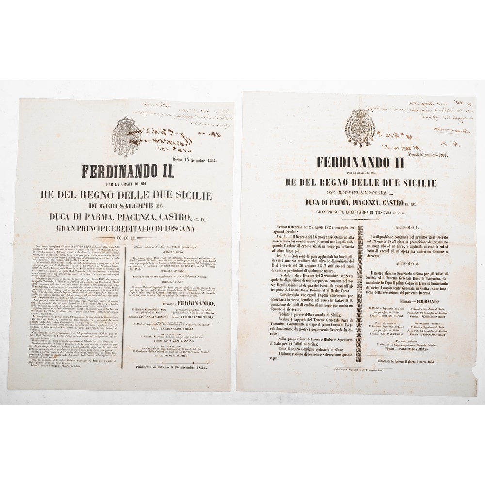 DUE DECRETI A STAMPA DEL REGNO DELLE DUE SICILIE, datati 13 Novembre 1854 e 6 marzo 1854. I decreti misurano cm 41 x 54 e cm 43 x 63. L’uno riguarda alcune esenzioni per le città di Palermo e Messina, l’altro la prescrizione dei crediti delle opere pie nei confronti dell’amministrazione regia.