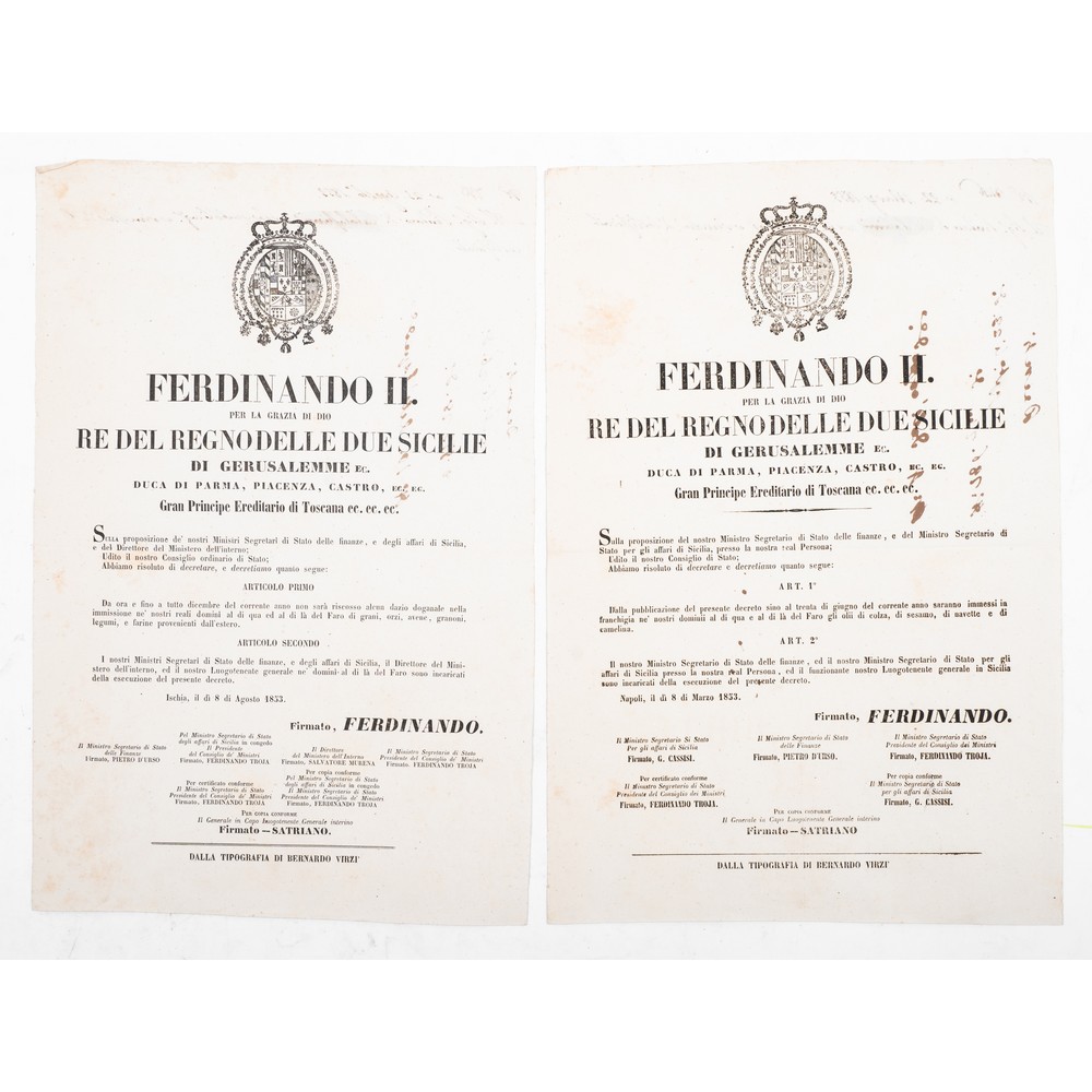 DUE DECRETI A STAMPA DEL REGNO DELLE DUE SICILIE, datati 8 Agosto 1853 e 8 marzo 1853. I decreti misurano cm 27 x 40. I decreti del ministero delle Finanze riguardano dazi sulle merci.