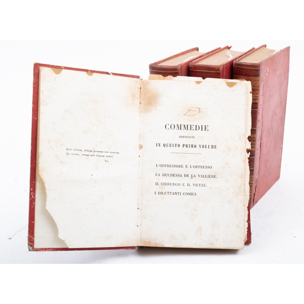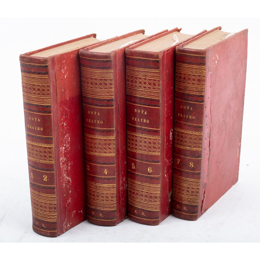 QUATTRO VOLUMI DEL XIX SECOLO SUL TEATRO: Alberto Nota TEATRO COMICO, ed. Galimberti tipografo e Pomba editore, Cuneo, Torino, 1842. In 4 tomi che comprendono 8 volumi. In 8°. Mezza pelle coeva con titoli, filetti e fregi in oro al dorso. Prima edizione collettiva delle commedie di questo autore teatrale piemontese. Carte a tratti fiorite, peraltro ben conservate. Qualche usura d’uso alle coperte. Pp. XVIII, (2), 316 (2); (2), 378, (2); 382, (2); 438, (2); 412; 390, (2); 368; 278, (2).