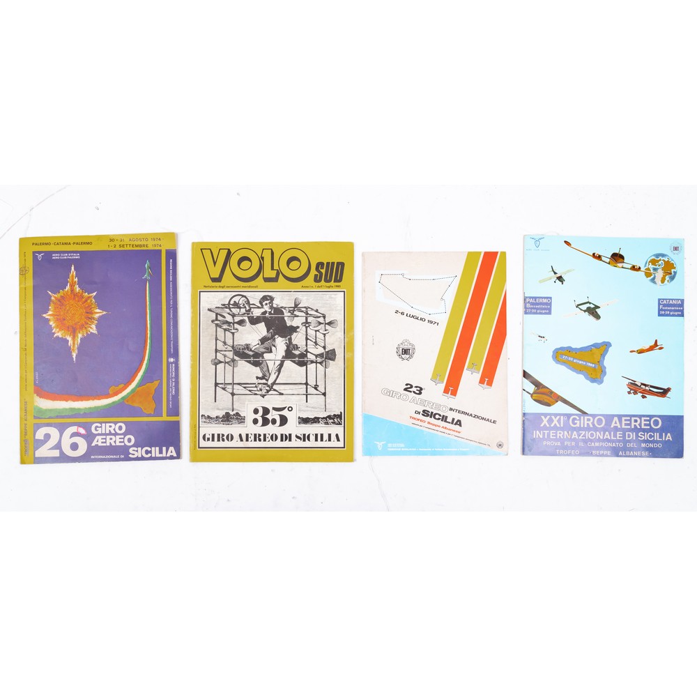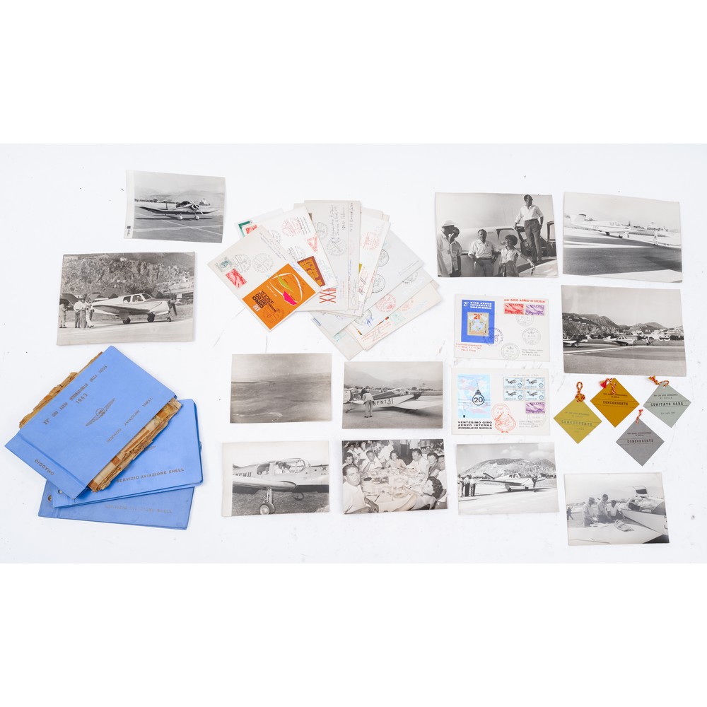 TRENTANOVE DOCUMENTI VARI relativi ai giri aerei di Sicilia. Il gruppo di documenti consta di 17 annulli postali, periodo 1968 – 1977; 4 riviste con i programmi dei giri di vari anni; 4 tagliandi di concorrente e giudice di gara del periodo 1963 – 1968; 11 fotografie periodo 1955 – 1964; tre raccoglitori ufficiali con le carte e le mappe per il volo anni 1957, 1960 e 1963.