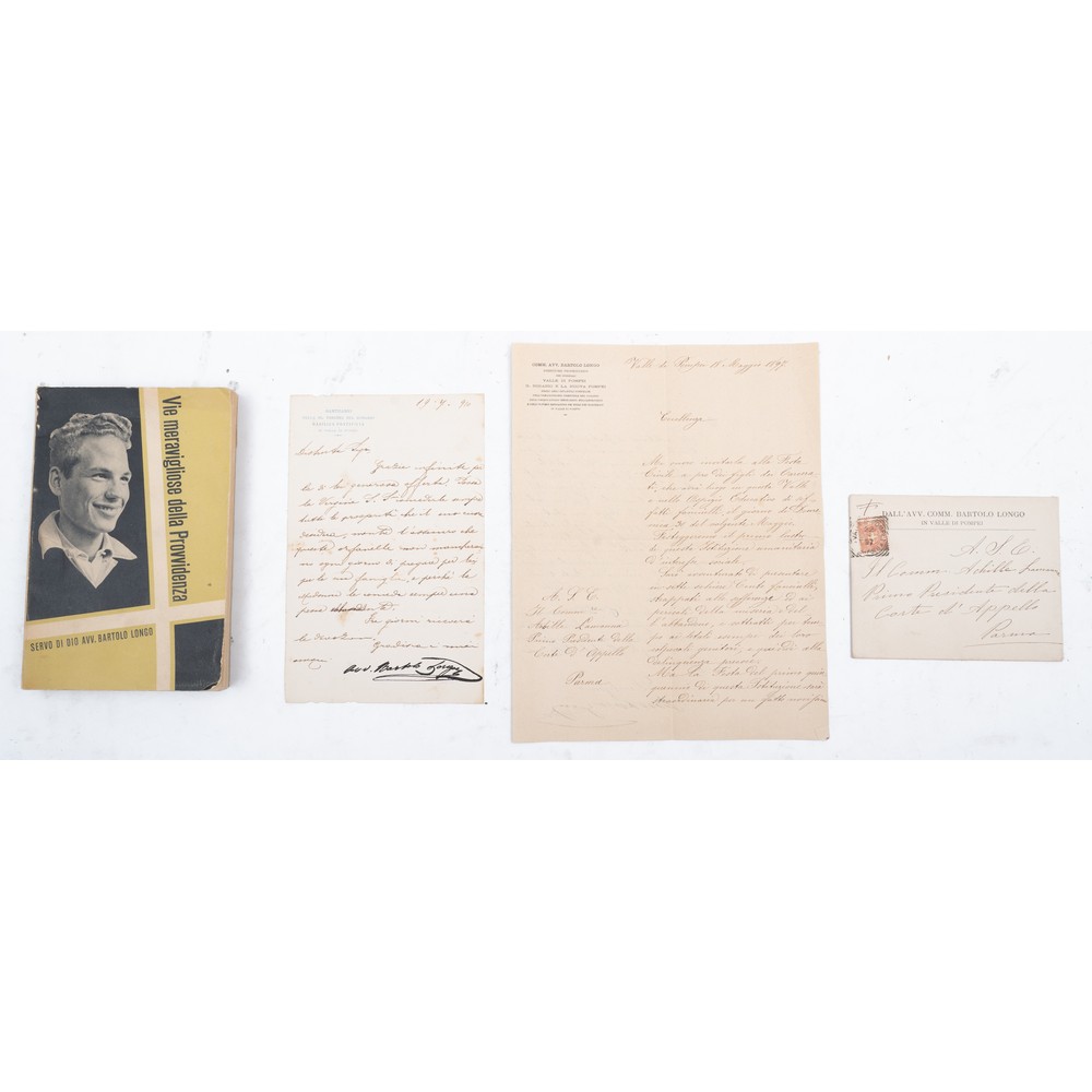 DUE LETTERE ED UN VOLUME del Beato Bartolo Longo. 1) Lettera datata 18 Maggio 1897 ed è inviata ad Achille Lamanna, Primo Presidente della Corte d’Appello di parma. La lettera è con la sua busta originale di spedizione affrancata ed è scritta su carta intestata di Bartolo Longo. 2) Lettera di ringraziamento per una offerta per il santuario, datata 19 Luglio 1910, inviata ad una devota della Madonna di Pompei, a firma autografa del Beato Longo e scritta su carta intestata del Santuario di Pompei. 3) Volume VIE MERAVIGLIOSE DELLA PROVVIDENZA. LE ORIGINI INTIME DELL’OPERA SALVATRICE DEI FIGLI DEI CARCERATI, ed. Istituto Editoriale Bartolo Longo, 1954. 1^ edizione. Raro. Volume di cm 20 x 13,5. Brossura editoriale illustrata. Pp. 258, (4), 16 fogli di tavole a piena pagina. Piccole usure ai piatti ma pagine in ottime condizioni di conservazione, pulite e ben tenute.