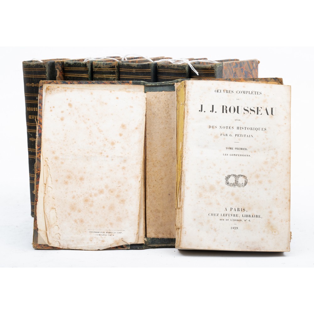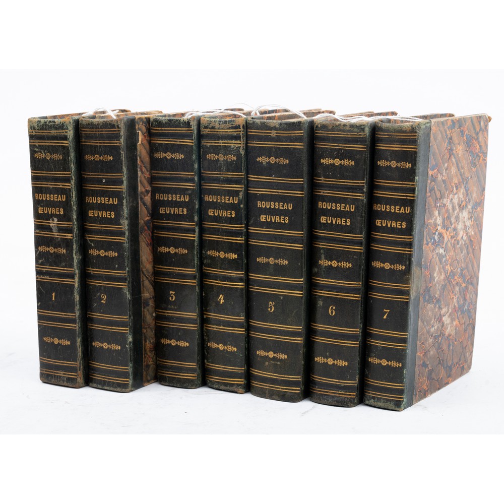 SETTE VOLUMI dell’opera OEUVRES COMPLETES DE J. J. ROUSSEAU AVEC DES NOTES HISTORIQUES PAR G. PETITAN, ed. Paris, Lefevre 1839. Legature successive in mezza pelle e piatti cartonati marmorizzati, con titoli, filetti e fregi in oro ai dorsi. In 8°. Volumi in buone condizioni. Con gli spartiti della canzoni delle truppe marcianti più volte ripiegate al vol. 6. Pp. 830; 717; 723; 727; 904; 755; 652.