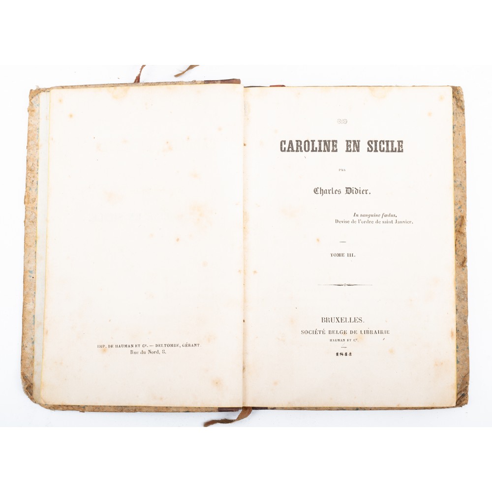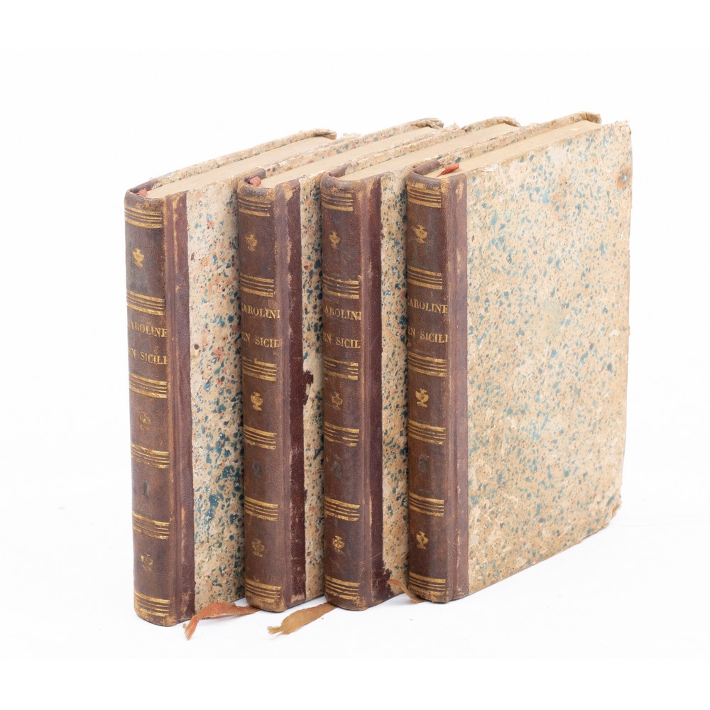 Charles Didier CAROLINE EN SICILIE, ed. Bruxelles, Societè Belge de Librairie 1844. In 4 volumi in 24°. Legature editoriali in mezza pelle con piatti marmorizzati e titoli e filetti in oro ai dorsi. Segnalibri originali in stoffa ancora presenti. Tagli colorati. L’opera, ispirata dalla figura della regina Carolina, oggi dimenticata, è un romanzo storico di molto pregio perché riesce utile ai fini di una ricostruzione d’ambiente e di atmosfera. Il romanzo si svolge in Sicilia durante il regno di Ferdinando IV e di Carolina, mentre gli inglesi la fanno da padroni. L’opera del Didier rappresenta vividamente la politica inglese verso l’isola mediterranea. Volumi in perfette condizioni. pp. 299; 241; 255; 248. Raro a trovarsi.