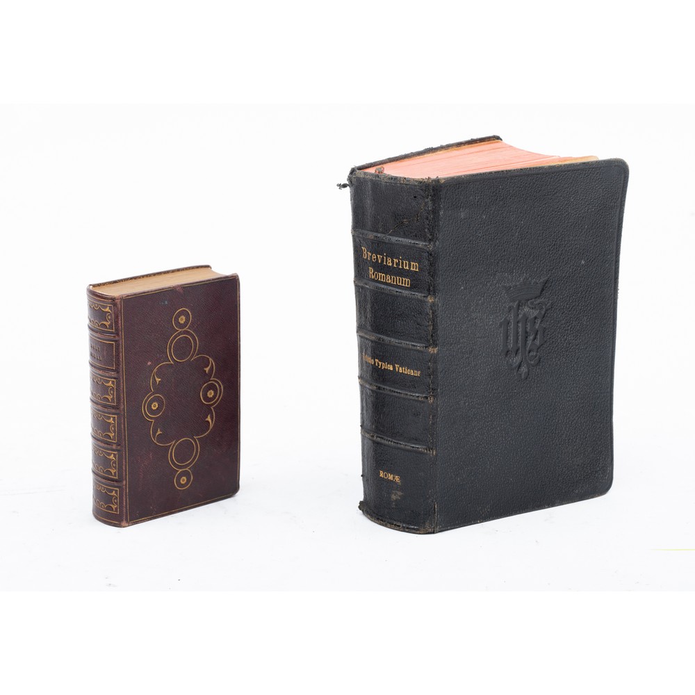 DUE VOLUMI DI RELIGIONE: 1) BREVIARIUM ROMANUM EX DECRETO …. PII PAPAE X, ed. Romae Typis Polyglottis Vaticanis 1928. In 8° piccolo. Legatura in piena pelle floscia con titoli impressi in oro al dorso e stemma impresso a freddo ai piatti. Tagli colorati. Testo su due colonne in bicromia rosso e nero. In perfette condizioni. Pp. LXXIX, 1514, 198, 74. 2) THE HOLY BIBLE, ed. Oxford, Samuel Colingwood and Co. 1828. In 24°. Bella legatura in piena pelle martellata con fregi in oro ai piatti e titoli e fregi in oro al dorso. In perfette condizioni. tagli dorati. Testo su due colonne. Pagine senza numerazione. Ex libris Tschinke – Daneu.