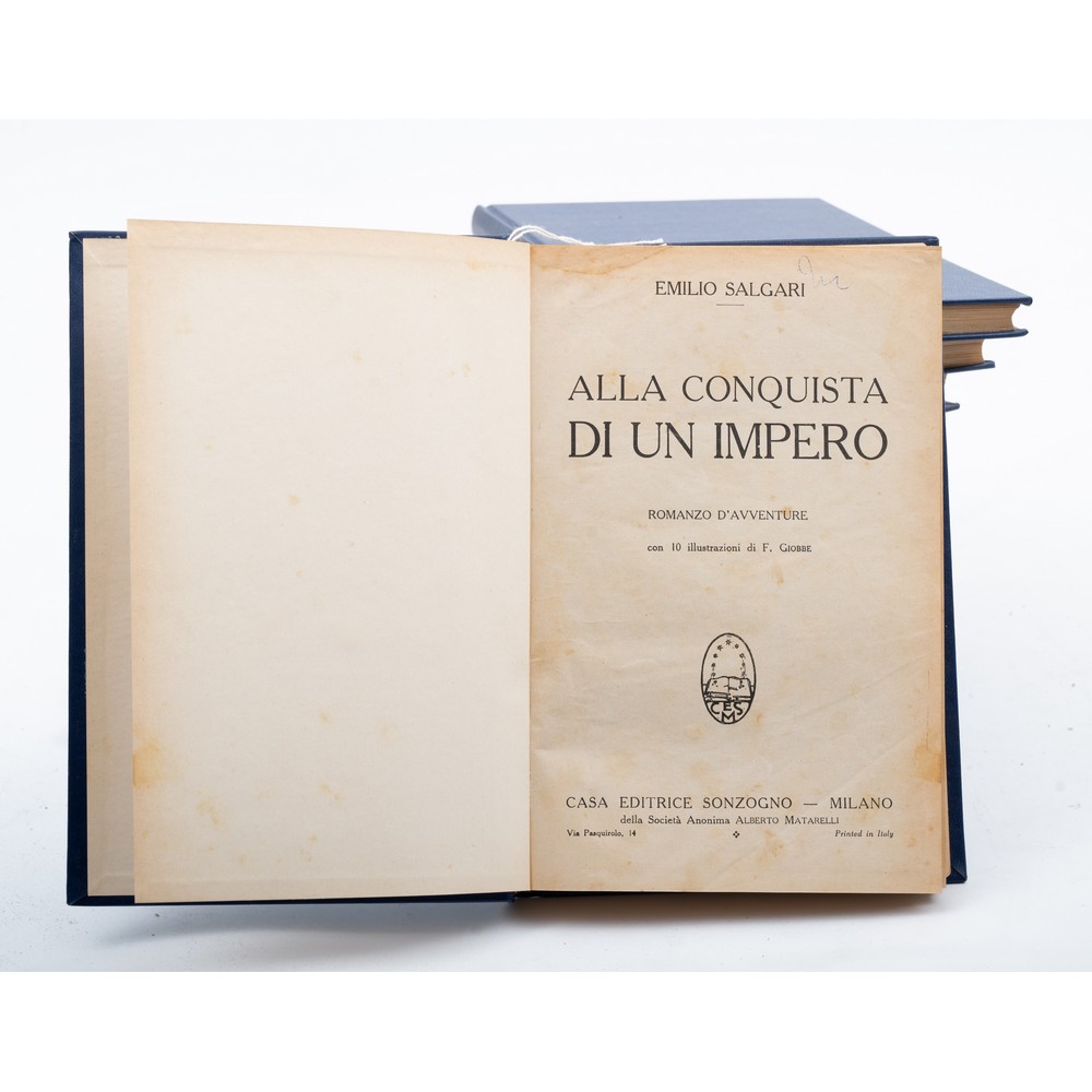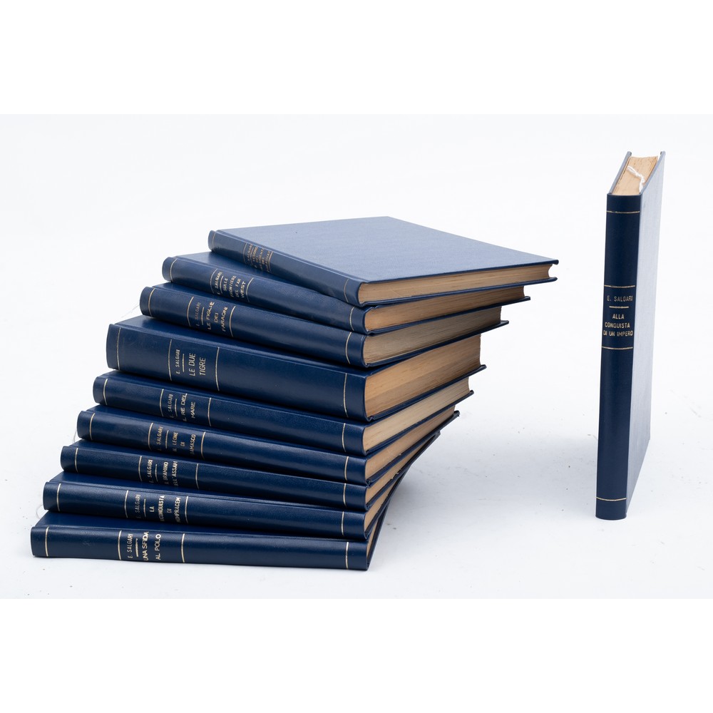 DIECI ROMANZI DI EMILIO SALGARI. I volumi, in 8°, contenenti le brossure originali, sono stati tutti rilegati successivamente con belle legature in piena pelle con titoli e filetti dorati al dorso: 1) LE DUE TIGRI, ed. Milano, Vallardi 1923. Avventure illustrate da 20 disegni di A. Della Valle. PP. 244. In buone condizioni. 2) IL RE DEL MARE, ed. Vallardi, Milano 1939. Romanzo illustrato da 20 disegni di A. Della Valle. Pp. 264.3) IL LEONE DI DAMASCO, ed. Sonzogno 1942. Con 20 illustrazioni del pittore A. Della Valle. Pp. 314, (4). 4) IL BRAMINO DELL’ASSAM, ed. Sonzogno 1930. Con 10 illustrazioni del pittore G. D’Amato. Pp. 219, (4). 5) LA RICONQUISTA DI MOMPRACEM, ed. Sonzogno 1930. Illustrato da 20 disegni di A. Della Valle. Pp. 280, (6).6) UNA SFIDA AL POLO, ed. Sonzogno 1930. Illustrato con 20 disegni di G. D’Amato. Pp. 219, (4). 7) ALLA CONQUISTA DI UN IMPERO, ed. Sonzogno 1930. Con 10 illustrazioni di F. Giobbe. Pp. 349 (1). 8) IL TESORO DEL PRESIDENTE DELPARAGUAY, ed. Sonzogno 1938. Con 10 illustrazioni del pittore F. Fabbi. Pp. 240.9) SULLE FRONTIERE DEL FAR WEST, ed. Sonzogno 1930. Con 20 disegni del pittore A. Della Valle. Pp. 254, (2).10) LE FIGLIE DEI FARAONI, ed. Milano, Vallardi 1927. Romanzo illustrato da 20 disegni di A. Della Valle. PP. 228.