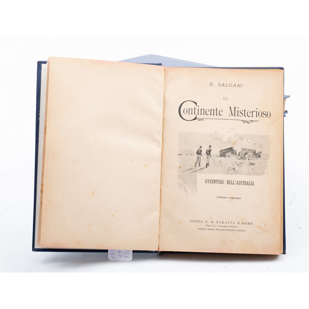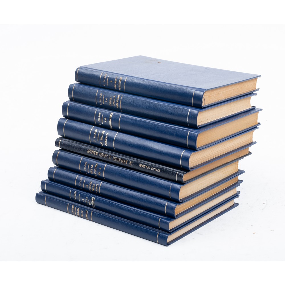 NOVE ROMANZI DI EMILIO SALGARI. I volumi contenenti le brossure originali, sono stati tutti rilegati successivamente con belle legature in piena pelle con titoli e filetti dorati al dorso: 1) LA TIGRE DELLA MALESIA, ed. O.L.M. Milano 1935. Pp. 255 con le illustrazioni di Fabio Fabbi.2) I CORSARI DELLE BERMUDE, ed. Boschi, Milano 1970. Pp. 153, (2). 3) IL CONTINENTE MISTERIOSO, ed. Paravia, Torino 1909. Pp. 240, con una tavola geografica a colori in antiporta e illustrazioni in b/n n.t di cui 20 a piena pagina di Carpanetto. 4) LA SCOTENNATRICE, ed. Bemporad e Figlio, Firenze 1920. Avventure illustrate da 20 disegni di A. Della Valle. Pp. 366.5) LE SELVE ARDENTI, ed. Firenze, Bemporad e Figlio 1910. Pp. 288. 6) LA CROCIERA DELLA TONANTE, ed. Bemporad e Figlio Firenze, 1928. Pp. 211.7) LA STELLA DELL’ARAUCANIA, ed. Bemporad e Figlio, Firenze 1921. Avventure con 10 tavole fuori testo di C. Chiostri. Pp. 252, (4). 8) LE AVVENTURE DI SIMON WANDER, Bemporad e Figlio 1921. Con 9 illustrazioni di Alberto Della Valle. Pp. 169, (2). 9) STRAORDINARIE AVVENTURE DI TESTA DI PIETRA, ed. Bemporad e Figlio Firenze, 1921. Illustrate da 20 disegni di Alberto Della Valle. Pp. 292.