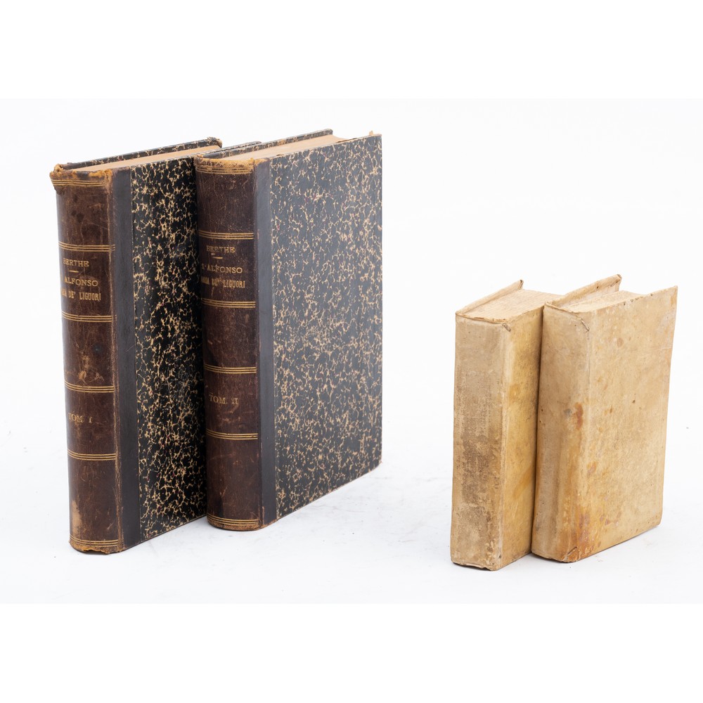 QUATTRO VOLUMI RELATIVI A SANT’ALFONSO MARIA DE’ LIGUORI: 1) P. Agostino Berthe SANT’ALFONSO MARIA DE’ LIGUORI, ed. Firenze, Barbera 1903. 2 volumi in 8° grande. Belle legature in mezza pelle con piatti marmorizzati e titoli e filetti impressi in oro ai dorsi. In perfette condizioni. pp. XX, 724; 738.2) S. Alfonso Maria De’ Liguori APPARECCHIO ALLA MORTE CIOE’ CONSIDERAZIONI SULLE MASSIME ETERNE, ed. Napoli, Gabinetto Letterario 1837. In 16°. Legatura coeva in piena pergamena muta. Note m.s. di appartenenza. Pp. 491. Sparse e sporadiche fioriture ma volume in perfette condizioni. 3) S. Alfonso Maria De’ Liguori LA VERA SPOSA DI GESU’ CRISTO OSSIA LA MONACA SANTA, , ed. Napoli, Gabinetto Letterario 1838. In 16°. Legatura coeva in piena pergamena muta. Note m.s. di appartenenza. Pp. 428. Sparse e sporadiche fioriture ma volume in perfette condizioni.