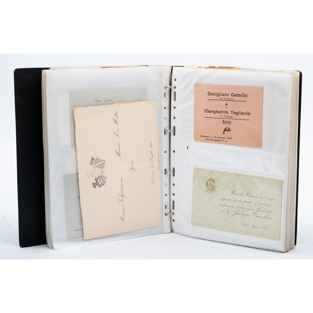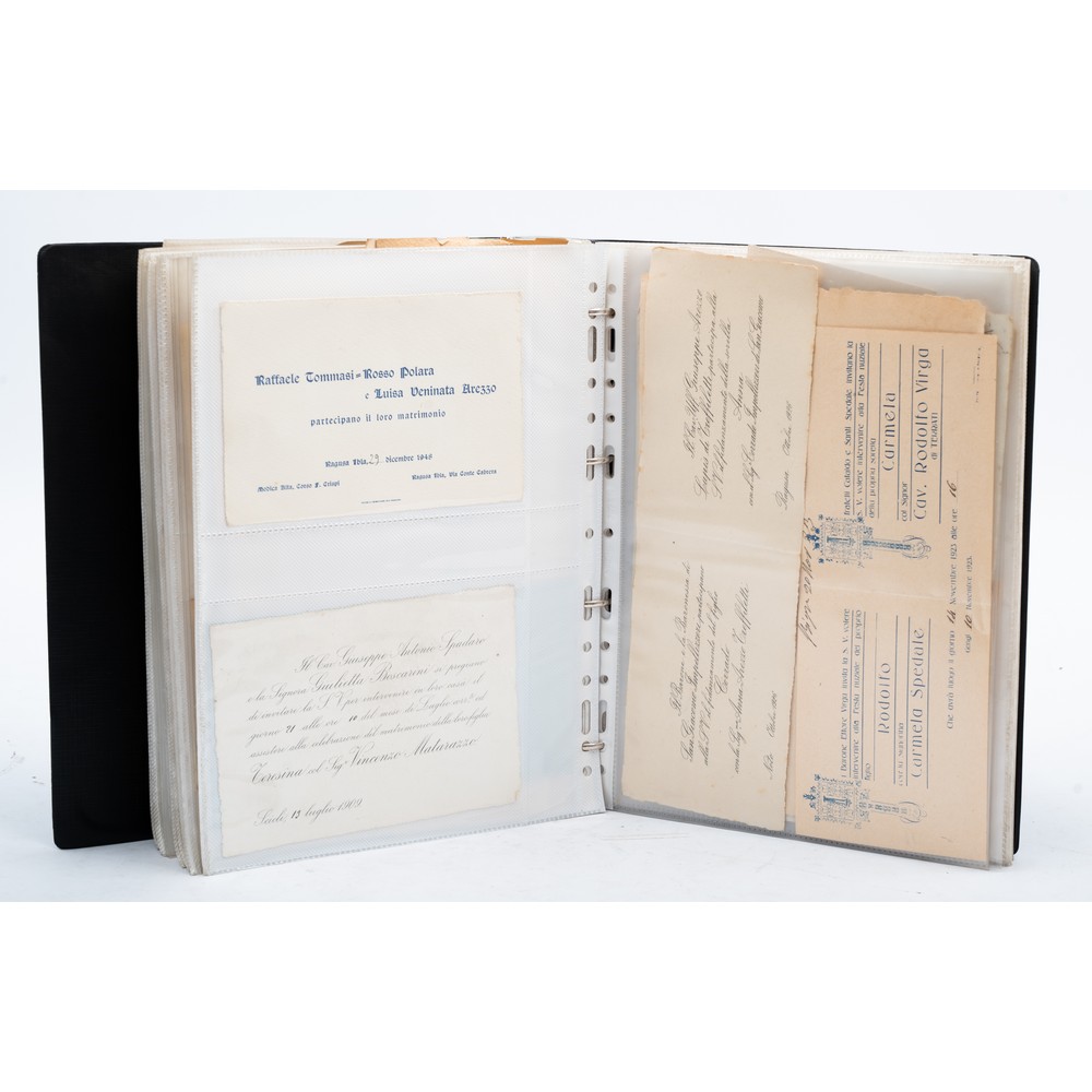 UN RACCOGLITORE CONTENENTE PARTECIPAZIONI DI NOZZE DELLA NOBILTA’ SICILIANA E ITALIANA, PERIODO FINE XIX – INIZIO XX SECOLO. Il raccoglitore contiene oltre 150 inviti di notissime famiglie nobili e aristocratiche siciliane e italiane del tempo.