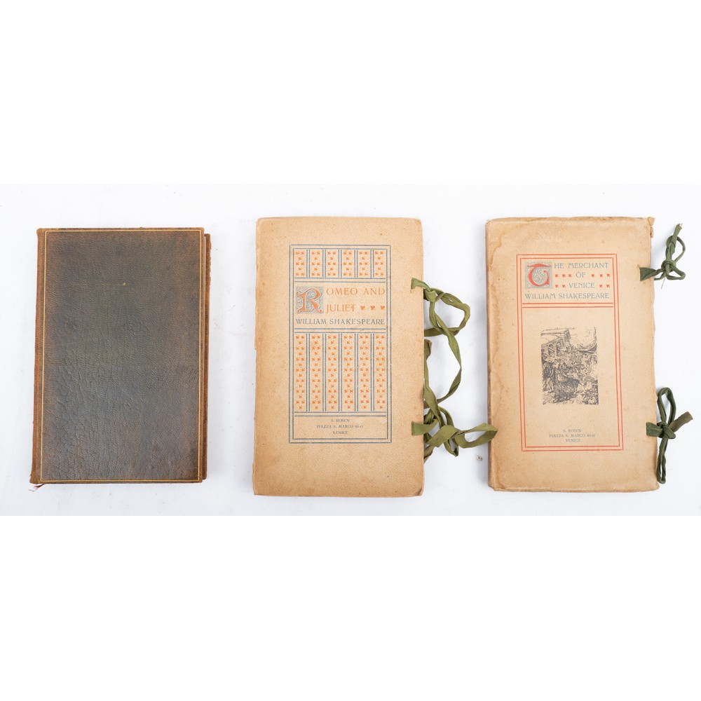 TRE VOLUMI IN 16° IN LINGUA INGLESE: 1) William Shakespeare THE MERCHANT OF VENICE, ed. S. Rosen , Venezia 1906. Bella legatura editoriale in cartonato marginoso con bandelle di chiusura in stoffa. In antiporta ritratto dell’autore. Al piatto anteriore titolo a colori con iniziale figurata e figura entro cornice. Al piatto posteriore ancora e dicitura “Aldine Series”. Tagli marginosi. Volume ancora intonso. Pp. 135.2) William Shakespeare ROMEO AND JULIET, ed. S. Rosen , Venezia 1908. Bella legatura editoriale in cartonato marginoso con bandelle di chiusura in stoffa. In antiporta ritratto dell’autore Al piatto anteriore titolo a colori con iniziale figurata e figura entro cornice. Al piatto posteriore ancora e dicitura “Aldine Series”. Tagli marginosi. Volume ancora intonso. Pp. 154. 3) William Makepeace Thackeray THE PARIS SKETCH BOOK. THE IRISH SKETCH BOOK AND NOTES OF A JOURNEY FROM CORNHILL TO GRAND CAIRO, ed. Thomas Nelson and Sons, London 1900. In 16°. Bella legatura in piena pelle con cornici in oro ai piatti, nervature titoli e fregi floreali impressi in oro al dorso. Segnapagine originale in stoffa. Tagli dorati. Stampato su carta velina. Dediche e note m. s. volume in ottime condizioni.