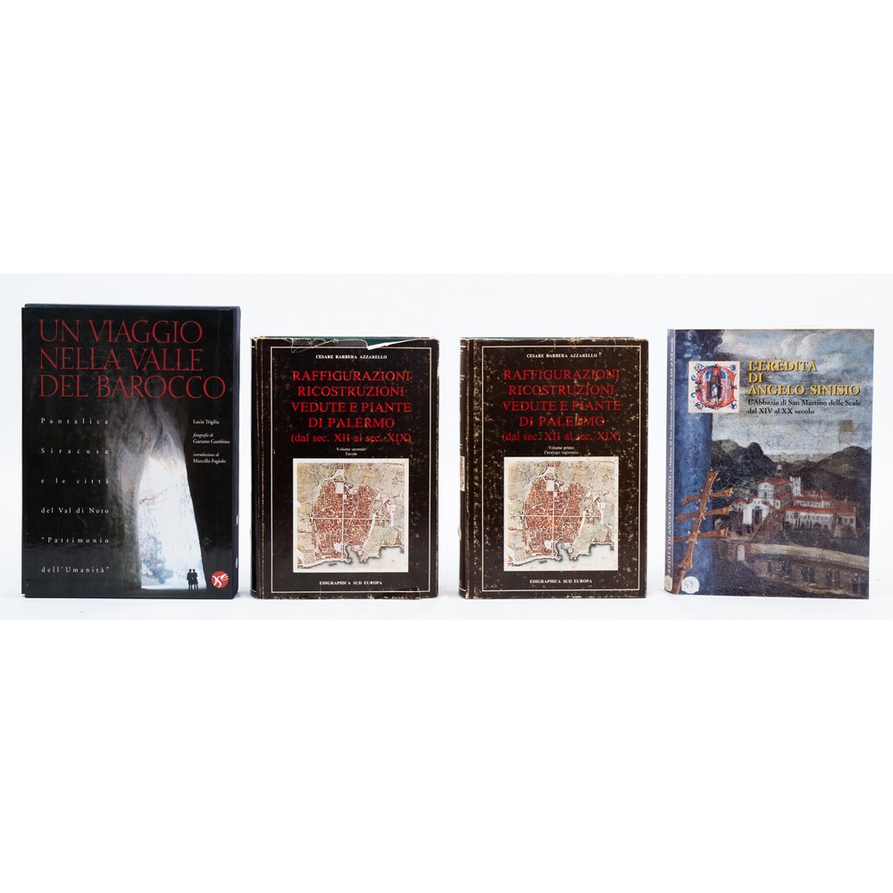 QUATTRO LIBRI D’ARTE SULLA SICILIA: 1) Lucia Trigilia UN VIAGGIO NELLA VALLE DEL BAROCCO, ed. Domenico Sanfilippo, Catania 2007. Legatura editoriale rigida plastificata illustrata. Cofanetto editoriale illustrato a specchio. Cm 35 x 25. Pp. 335 con illustrazioni n. t. e f. t. 2) Maria Concetta Di Natale / Fabrizio Messina Cicchetti – a cura di - L’EREDITA’ DI ANGLEO SINISIO. L’ABBAZIA DI SAN MARTINO DELLE SCALE DAL XVI AL XX SECOLO, ed. Abbazia di San Martino delle Scale 1998. Fotografie di Enzo Brai. Brossura editoriale illustrata con mezze ali. Cm 33 x 23,5. Pp. 348. Stampato a colonne. Dedica autografa di Enzo Brai al frontespizio. 3) Cesare Barbera Azzarello RAFFIGURAZIONI RICOSTRUZIONI VEDUTE E PIANTE DI PALERMO (DAL SEC. XII AL SEC. XIX), Ed. Edigraphica Sud Europa, Palermo 1980. In 2 volumi: Catalogo Ragionato (vol.1) e Tavole (vol.2). Cm 32 x 22. Legatura editoriale in tela verde con titoli in oro al dorso. Sopraccoperta editoriale illustrata. Risguardie illustrate. Pp. 375; 290.
