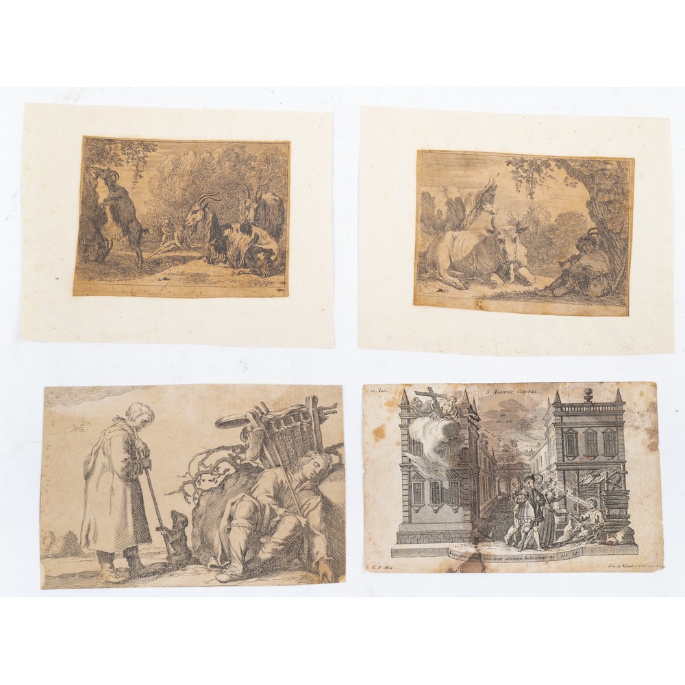 QUATTRO PICCOLE INCISIONI DEL XVII – XVIII SECOLO: Le tavole di dimensioni variabili, rappresentano scene di carattere religioso e bucolico.