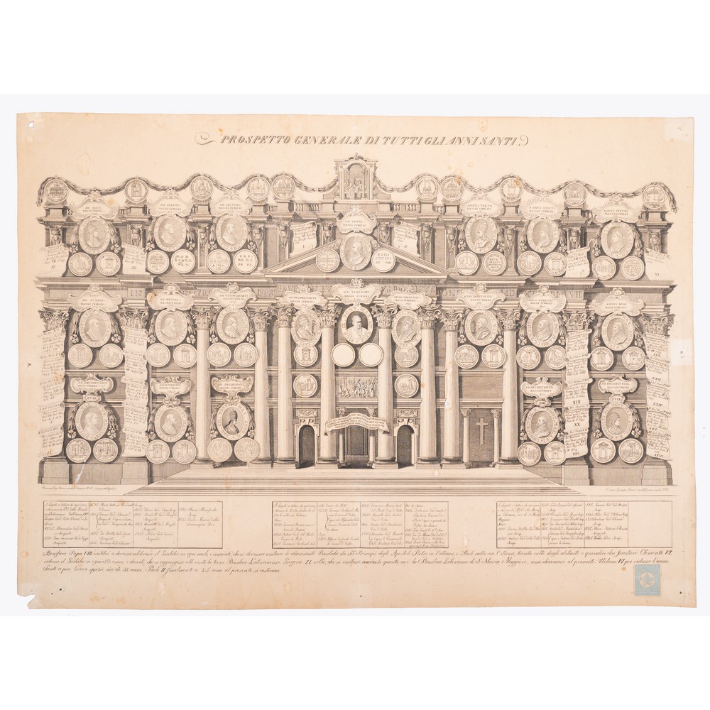 INCISIONE ALL’ACQUAFORTE DEL XIX SECOLO: PROSPETTO GENERALE DI TUTTI GLI ANNI SANTI. L’opera fu eseguita a Roma dall’incisore Luigi Banzo (1805 – 1877). Dimensioni cm 66 x 48.