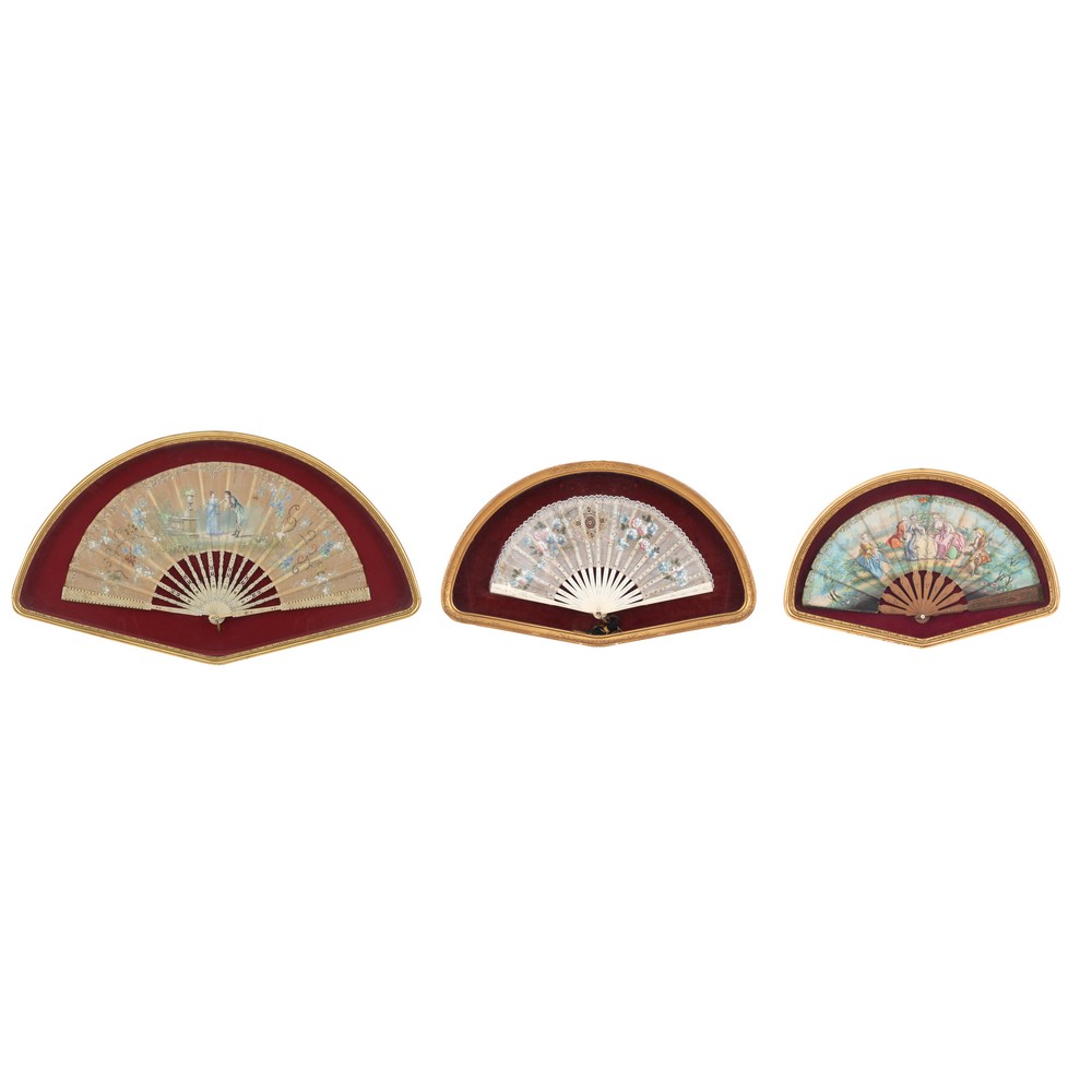 Ventaglio con pagina in seta e stecche in osso con pittura raffigurante "Scena galante" entro ventagliera e due ventagli con pagina in seta e stecche in osso entro ventagliere.