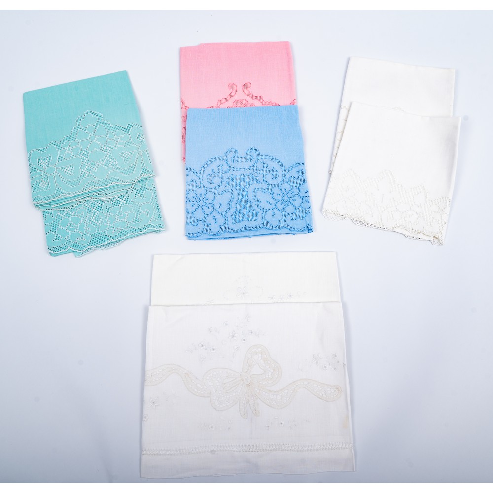 OTTO ASCIUGAMANI in lino nei toni del bianco, celeste, verde e rosa con ricami a mano.