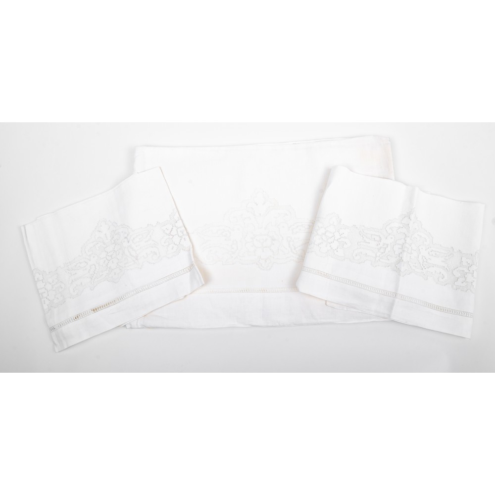LENZUOLO matrimoniale con due federe in tessuto di lino nei toni del bianco con ricami a mano.