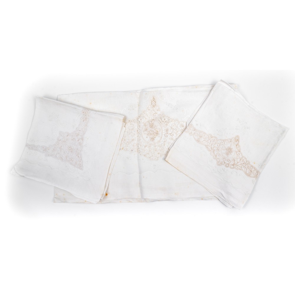 LENZUOLO matrimoniale con due federe in tessuto di lino nei toni del bianco con ricami a mano (usure e macchie).