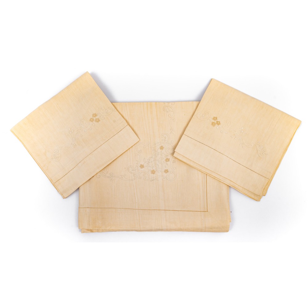 LENZUOLO matrimoniale con due federe in tessuto di lino nei toni del beige con ricami a mano (usure e macchie).